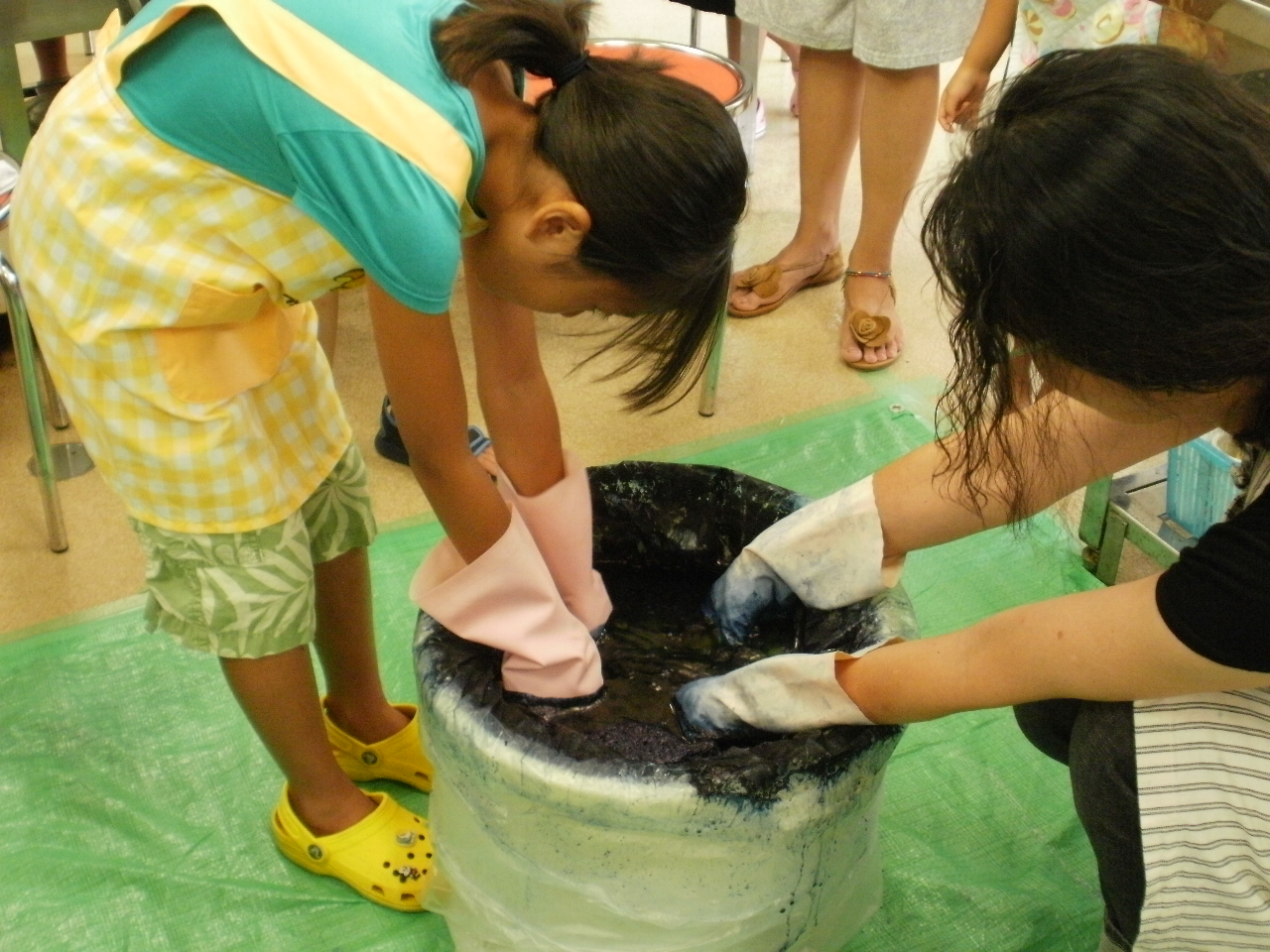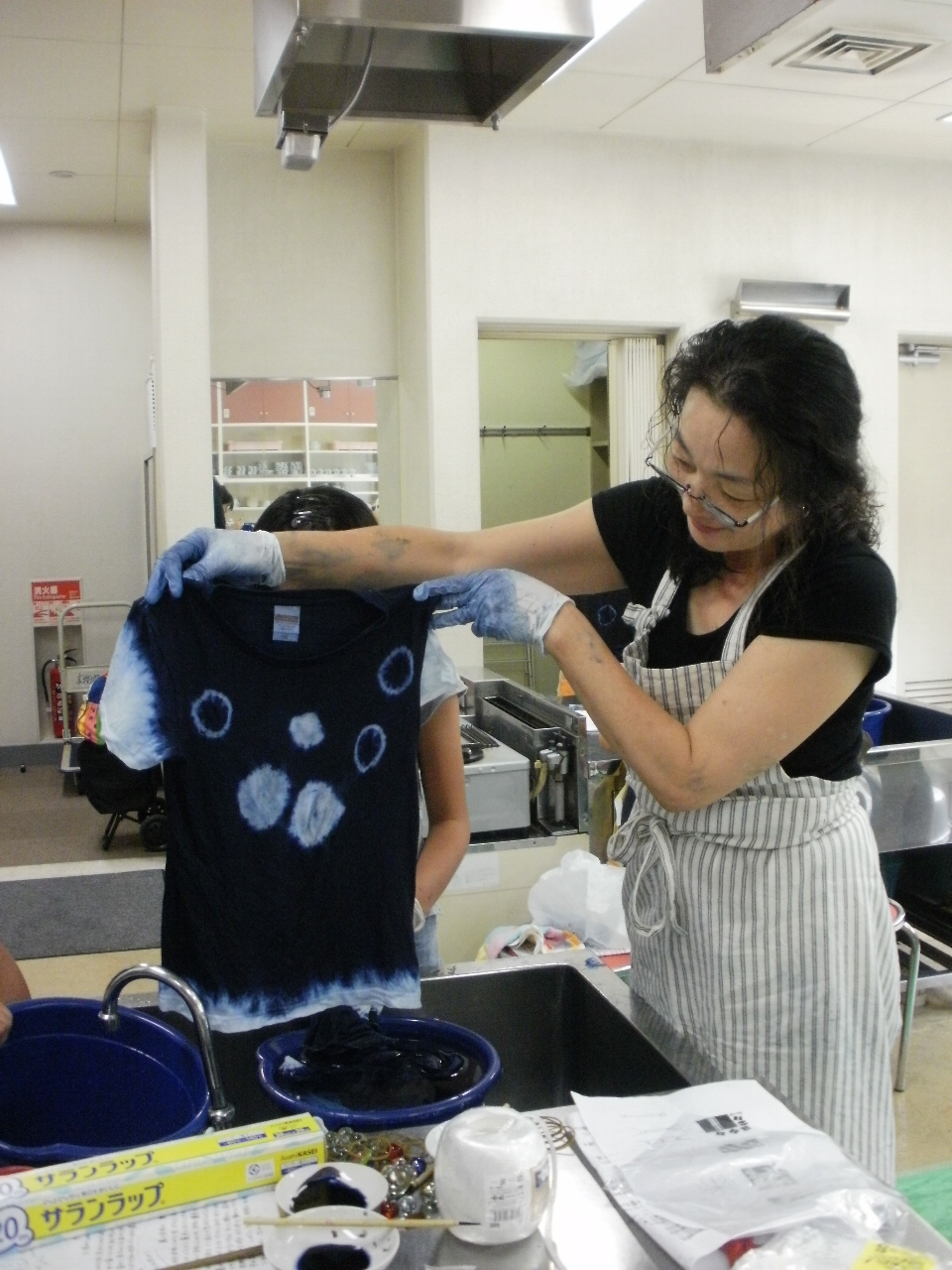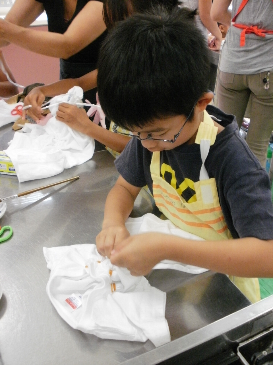 模様を頭に描きながら、輪ゴム・ビー玉そして、ビニールひもや 麻ひもを使って下準備をします。真剣! 藍染液につけこむと、白いシャツが黄色く変色..... それから空気にふれさせると真っ青な藍色! 結んだ紐をほどいて..... 世界に一枚のTシャツできた!!