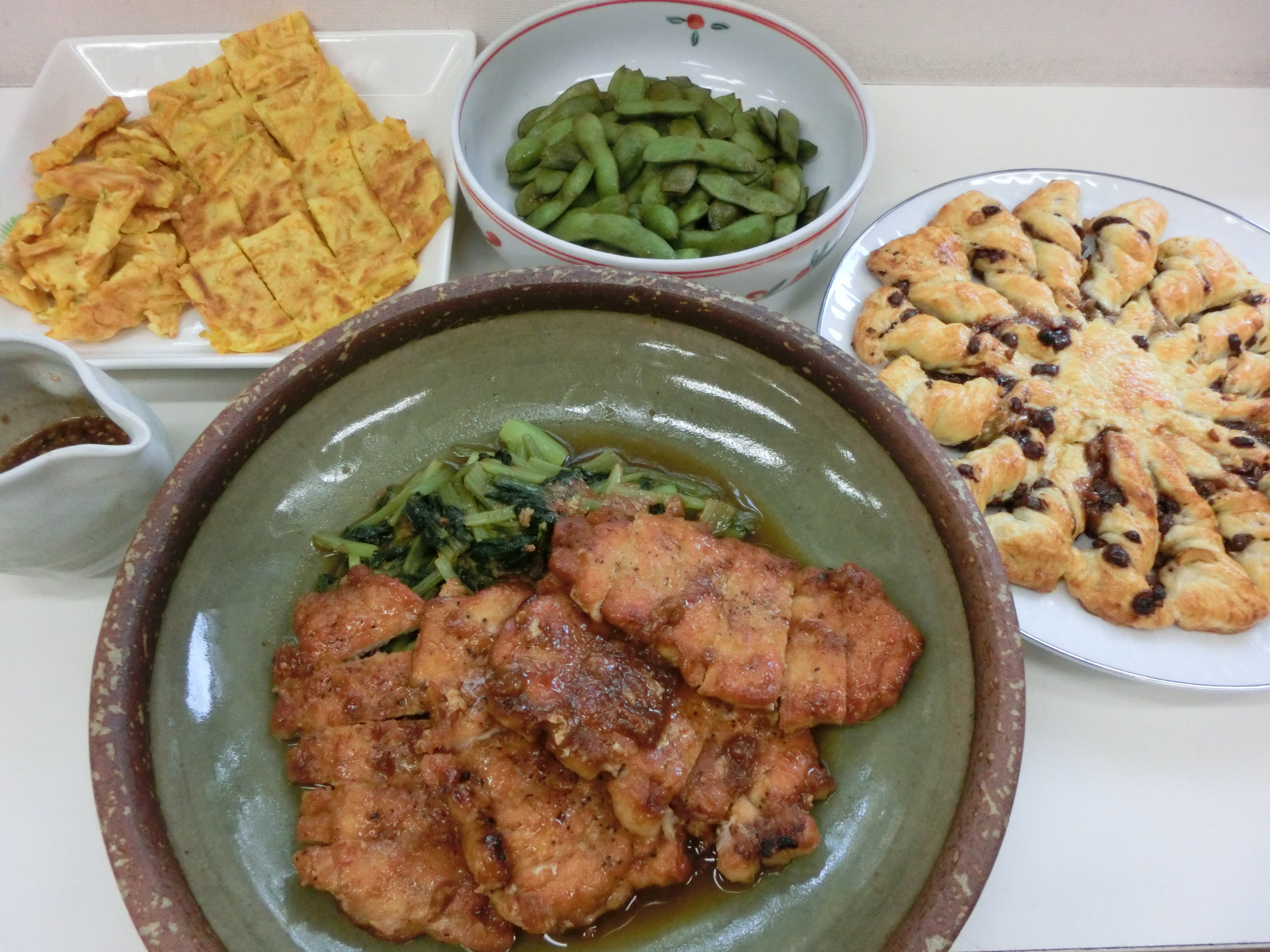 思わずご飯がすすむ ・トンテキ梅ソース 季節の常備菜は ・枝豆の醤油漬け ・かぼちゃのお焼き デザートはひと手間プラスで おもてなしにもお勧めな ・タルトソレイユ(パイ) を作りました