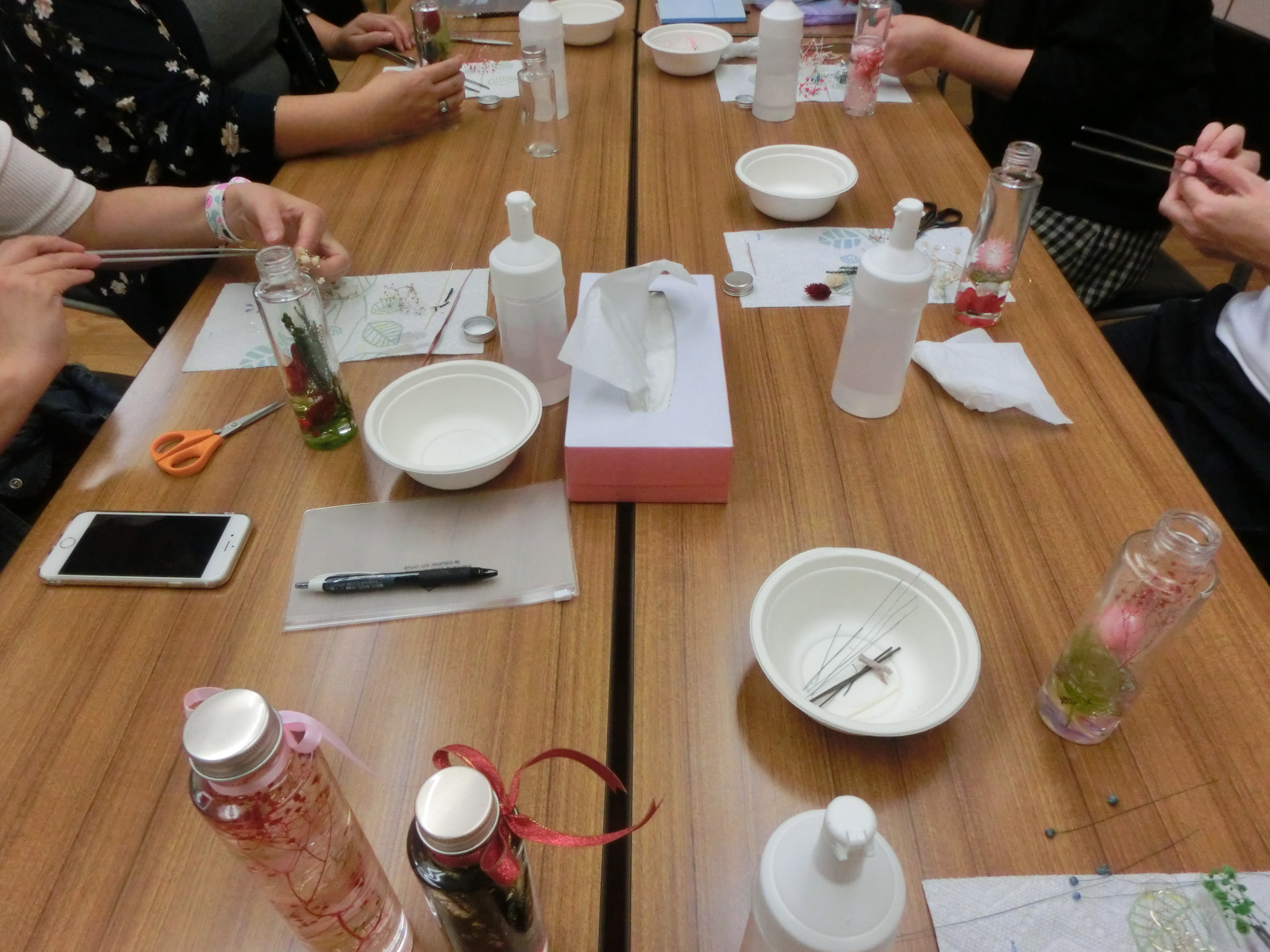 透明ボトルに入れる プリザーブドフラワーなどを 選ぶ楽しみからスタート 選んだ素材によって 同じボトルでも 雰囲気が全く異なって・・・ リボンを付けて完成です