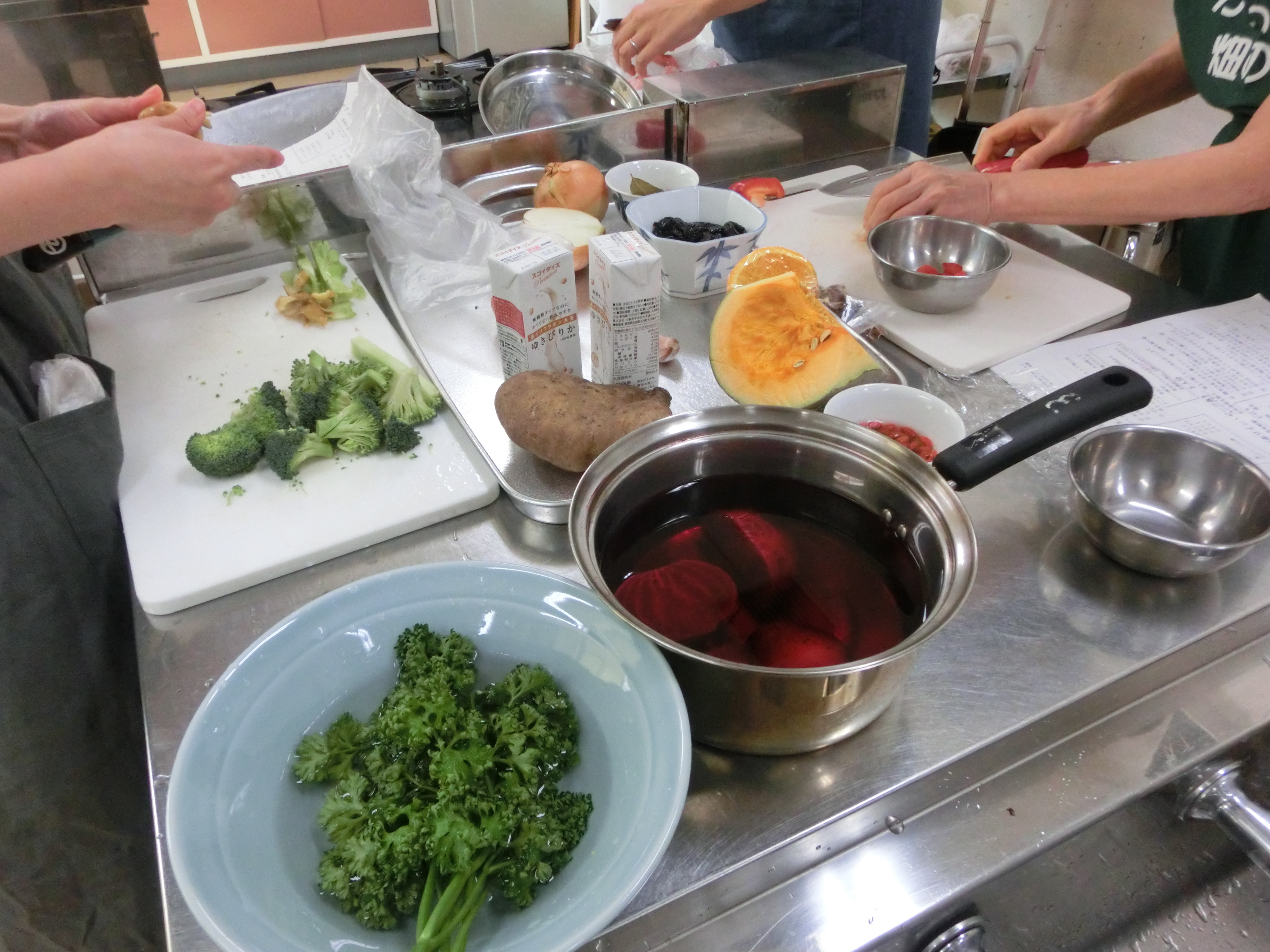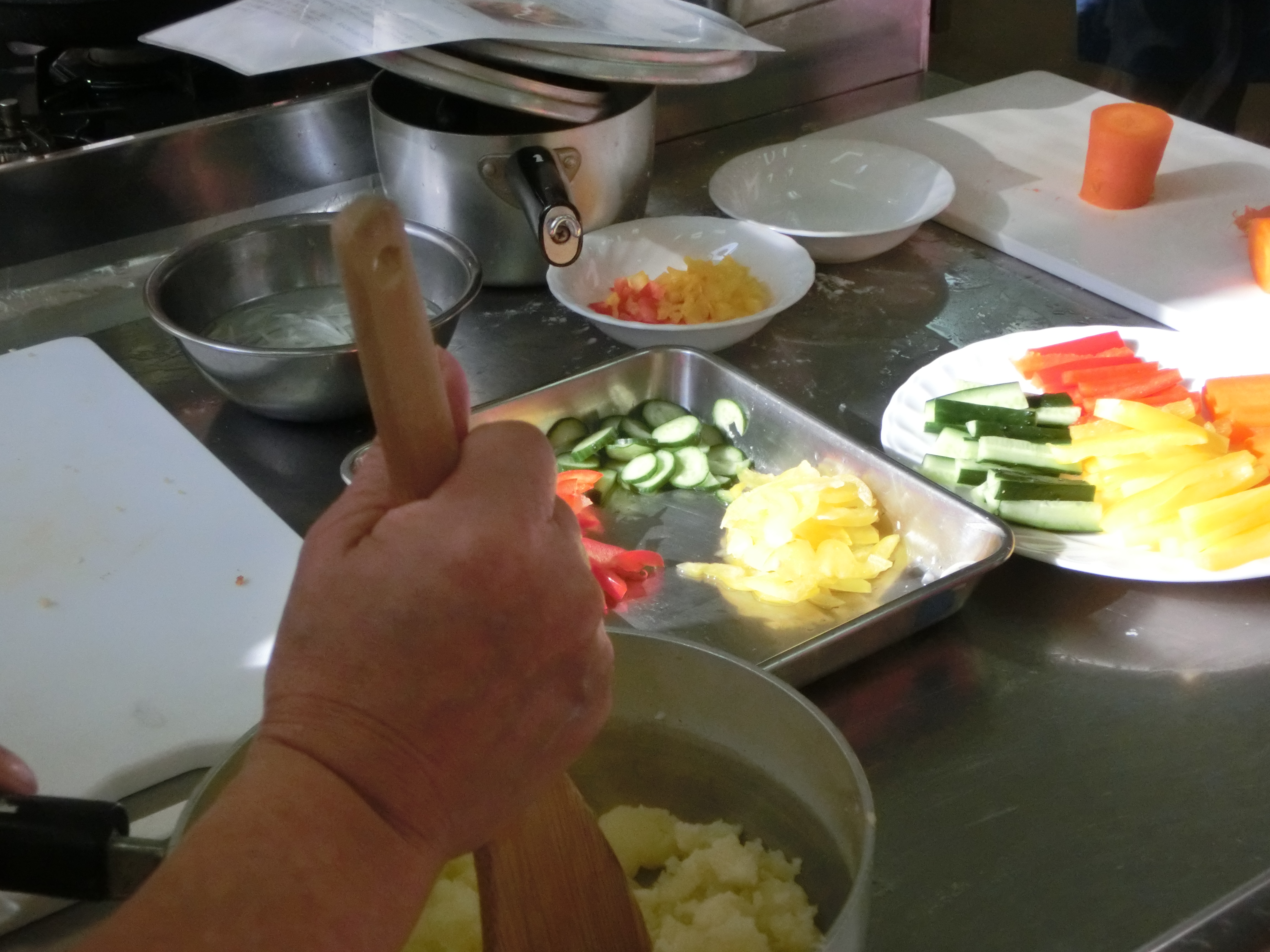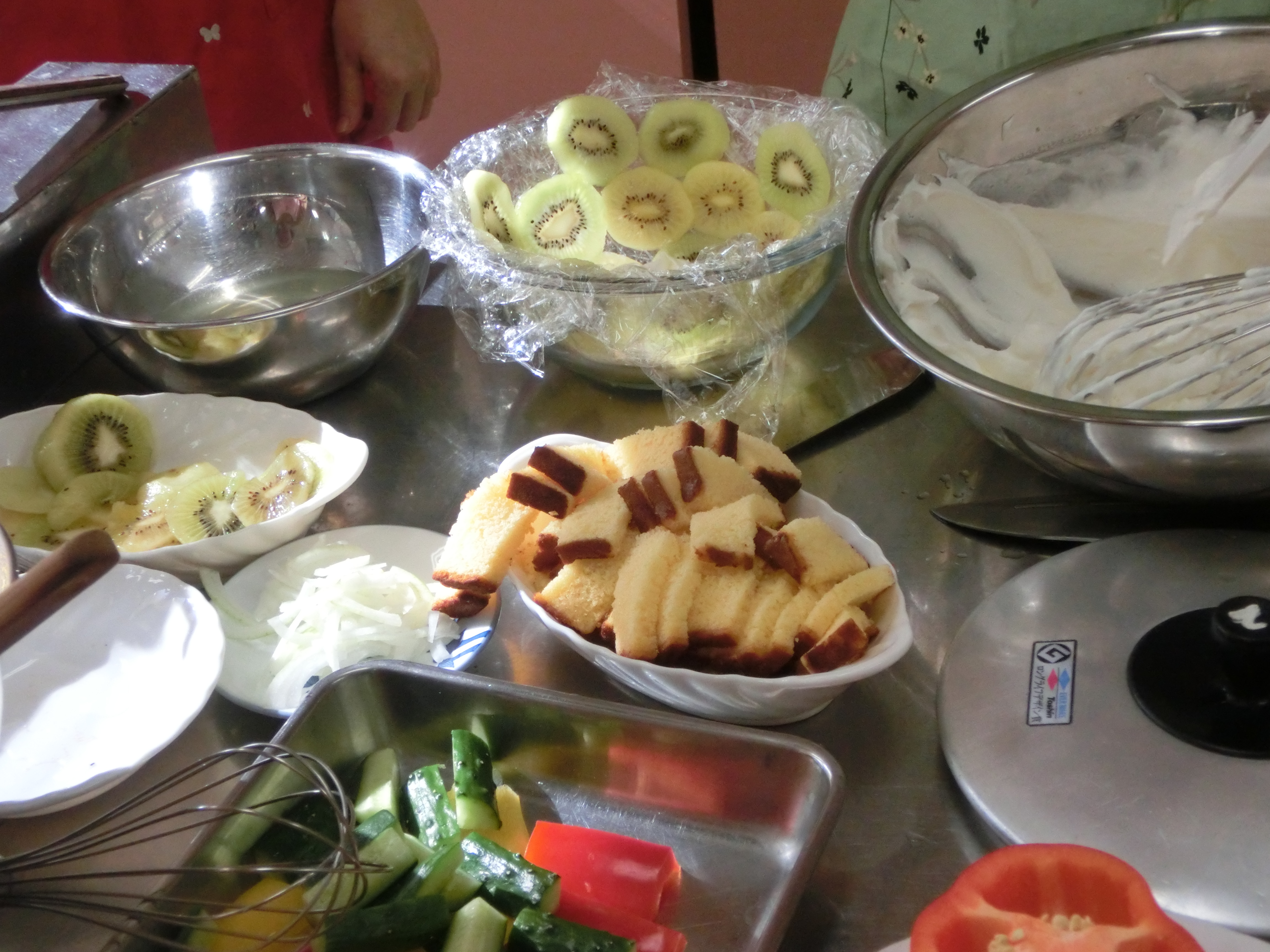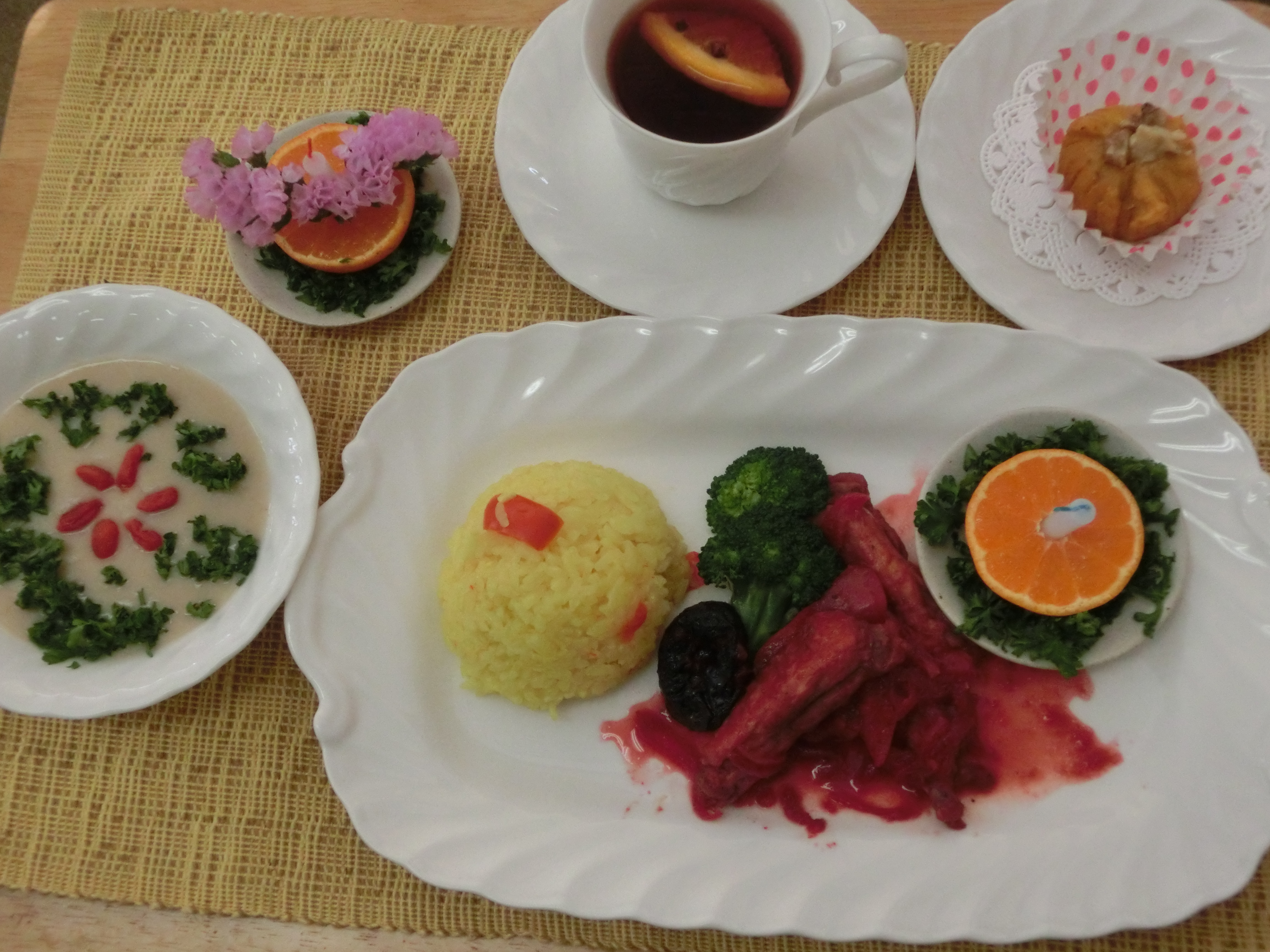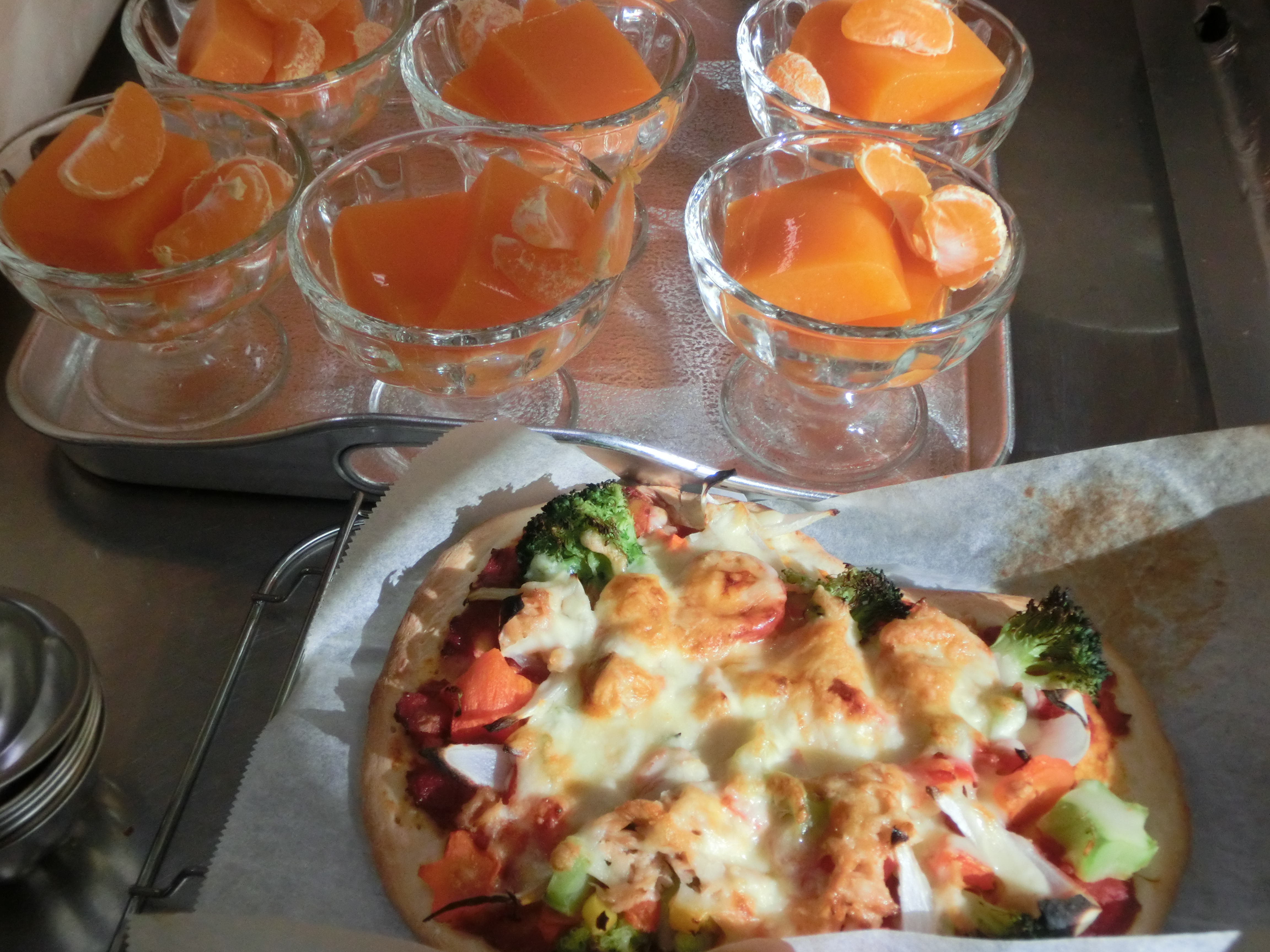 中区ヘルスメイトの協力で実施 分量を合わせてこねて 発酵させて トマトソースもデザートのキャロットゼリーも ヘルスメイト皆さんの手作り リースの形にしたり ペットの形にしたり 思い思いのクリスマスピザが 美味しく焼きあがりました