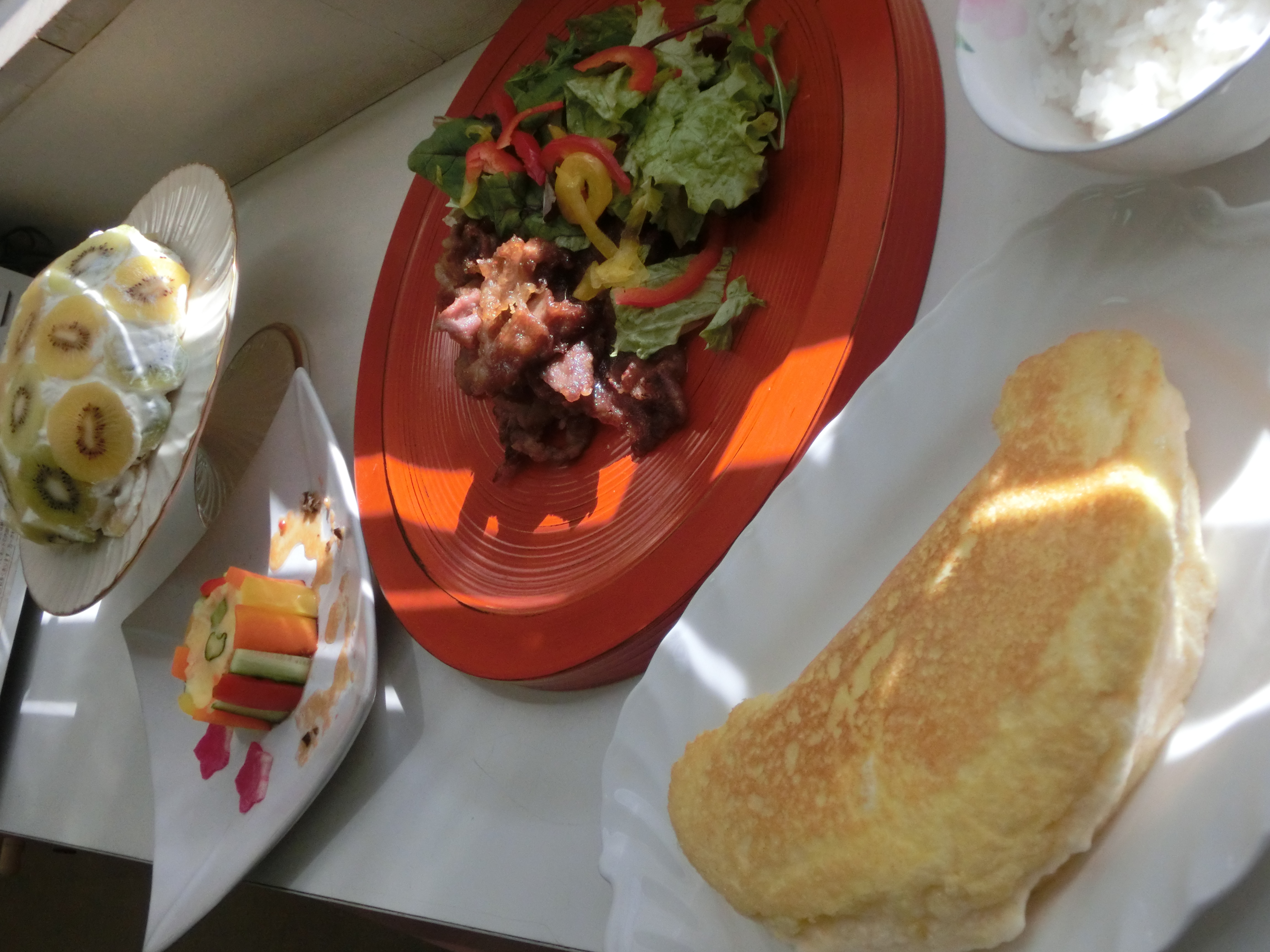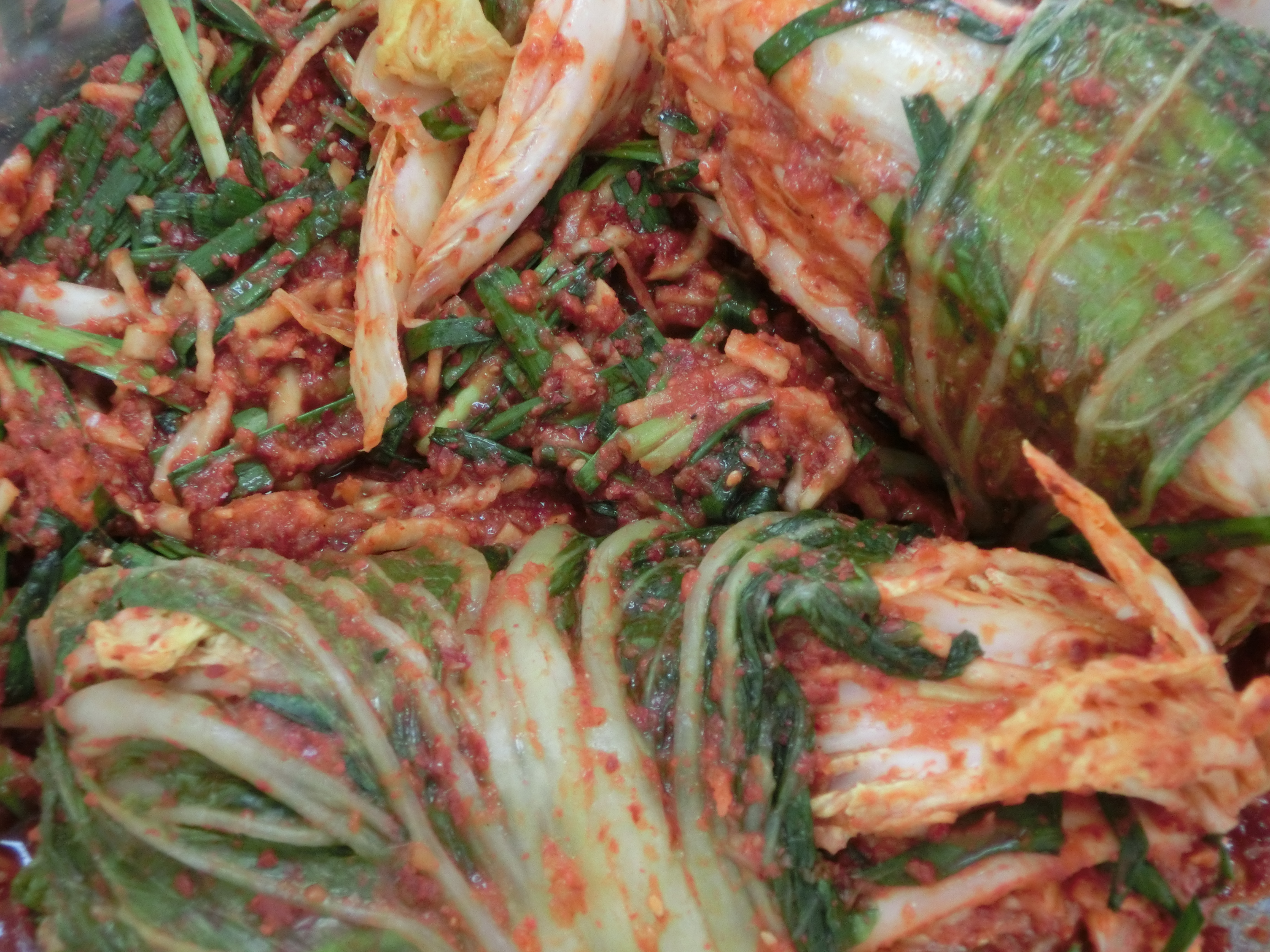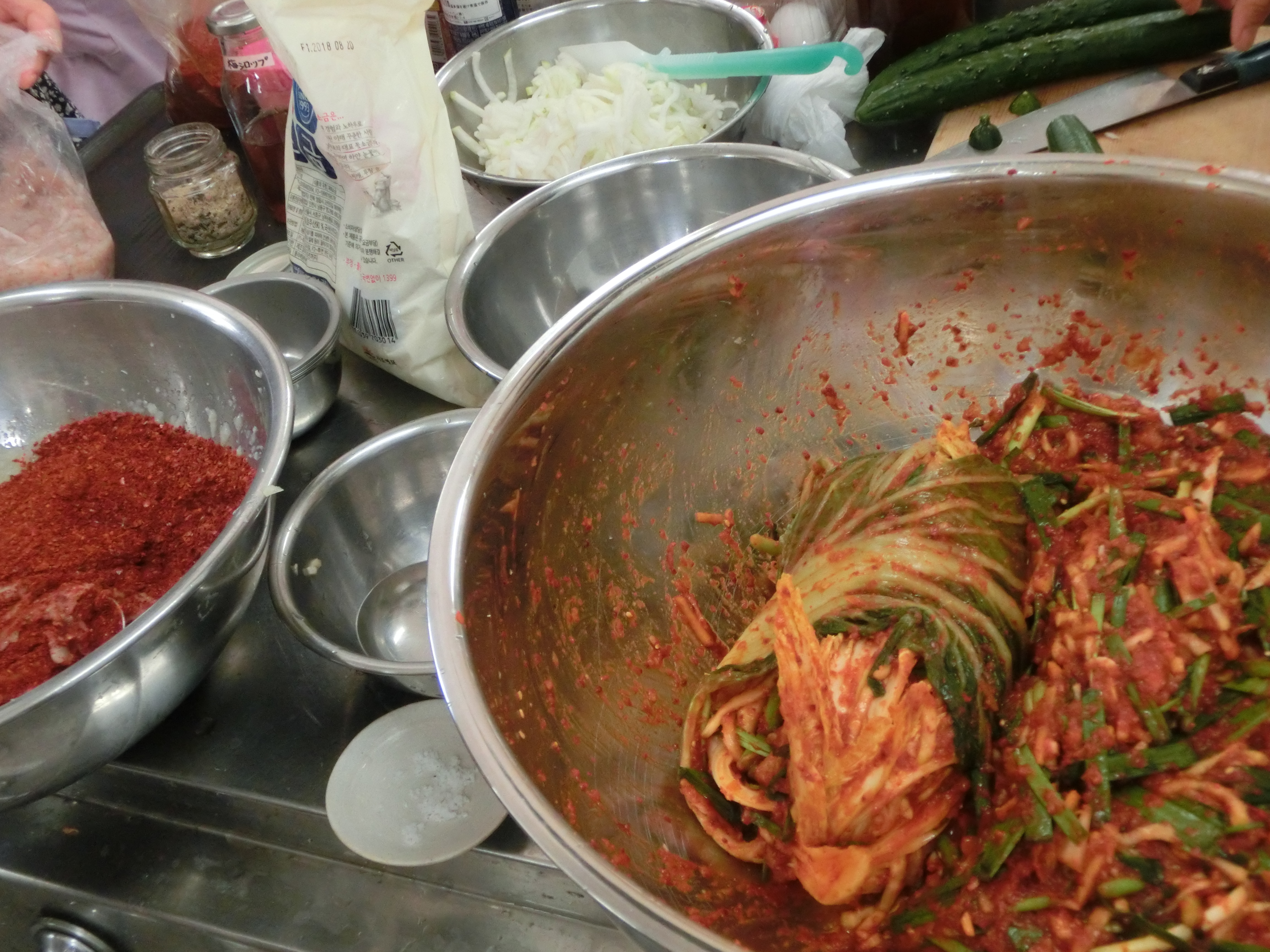 今年の白菜は 暑さの影響か大玉! 1枚1枚の葉の厚みがあり 下準備に一苦労 (李先生 お疲れ様でした) 様々な香辛料・食材を混ぜて ヤンニョムジャン作り 出来立てキムチで お肉とご飯・スープのお昼ごはん これから発酵が進むにつれて 味の変化も楽しみです