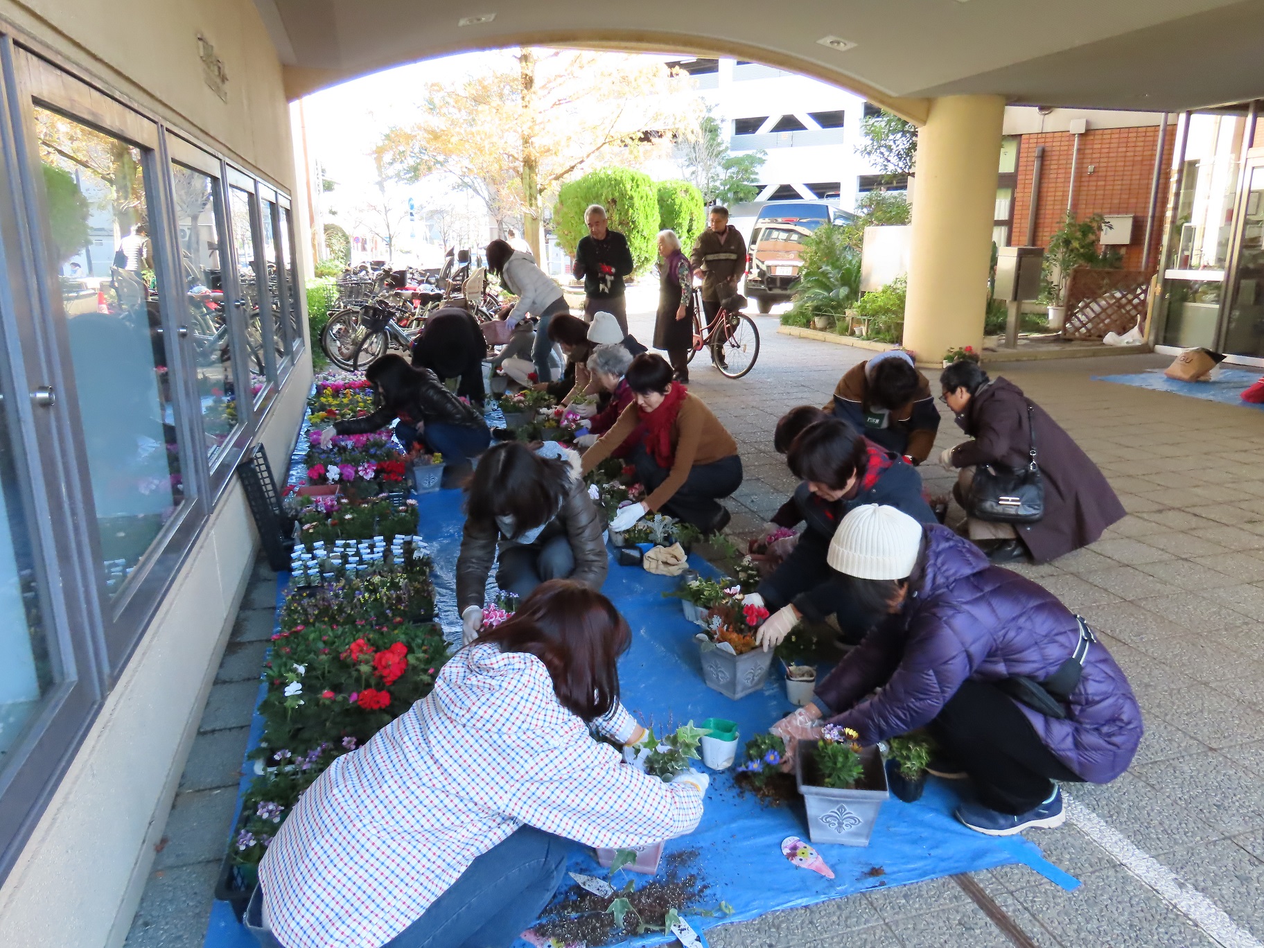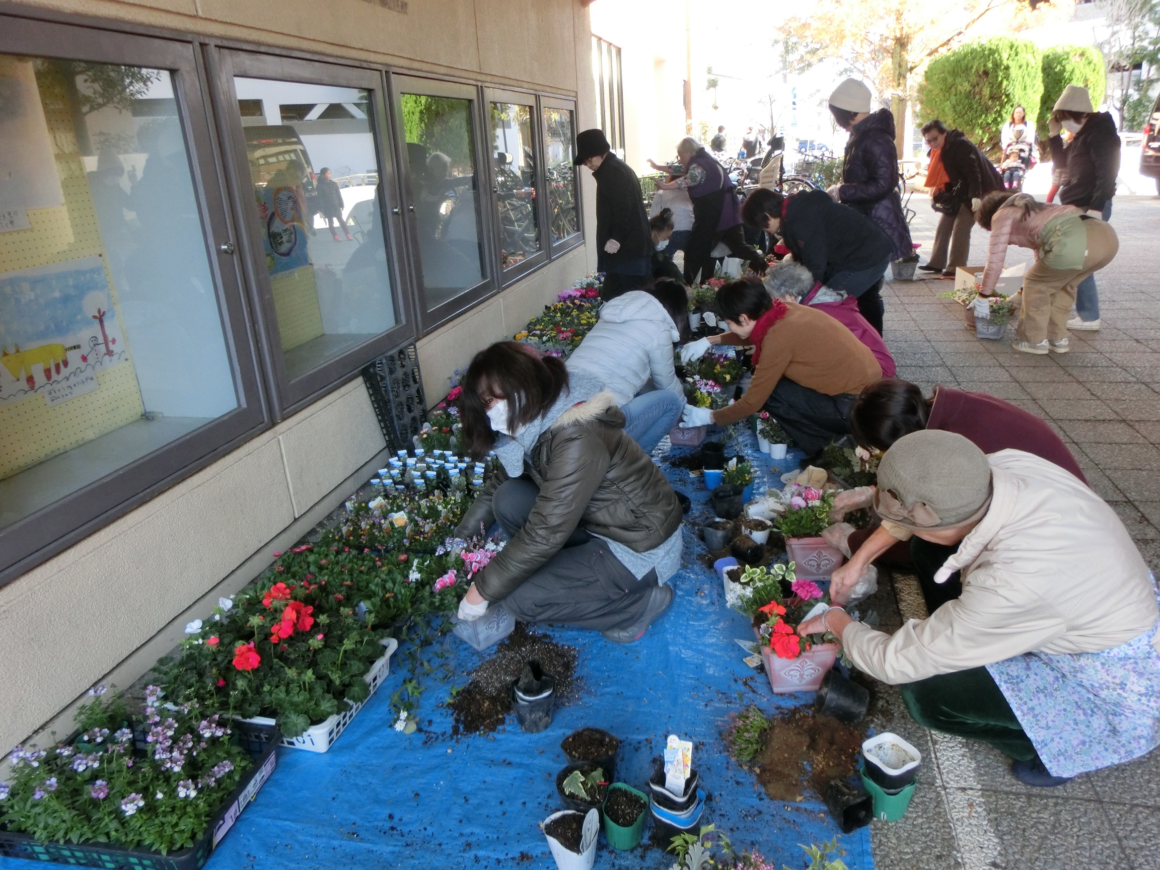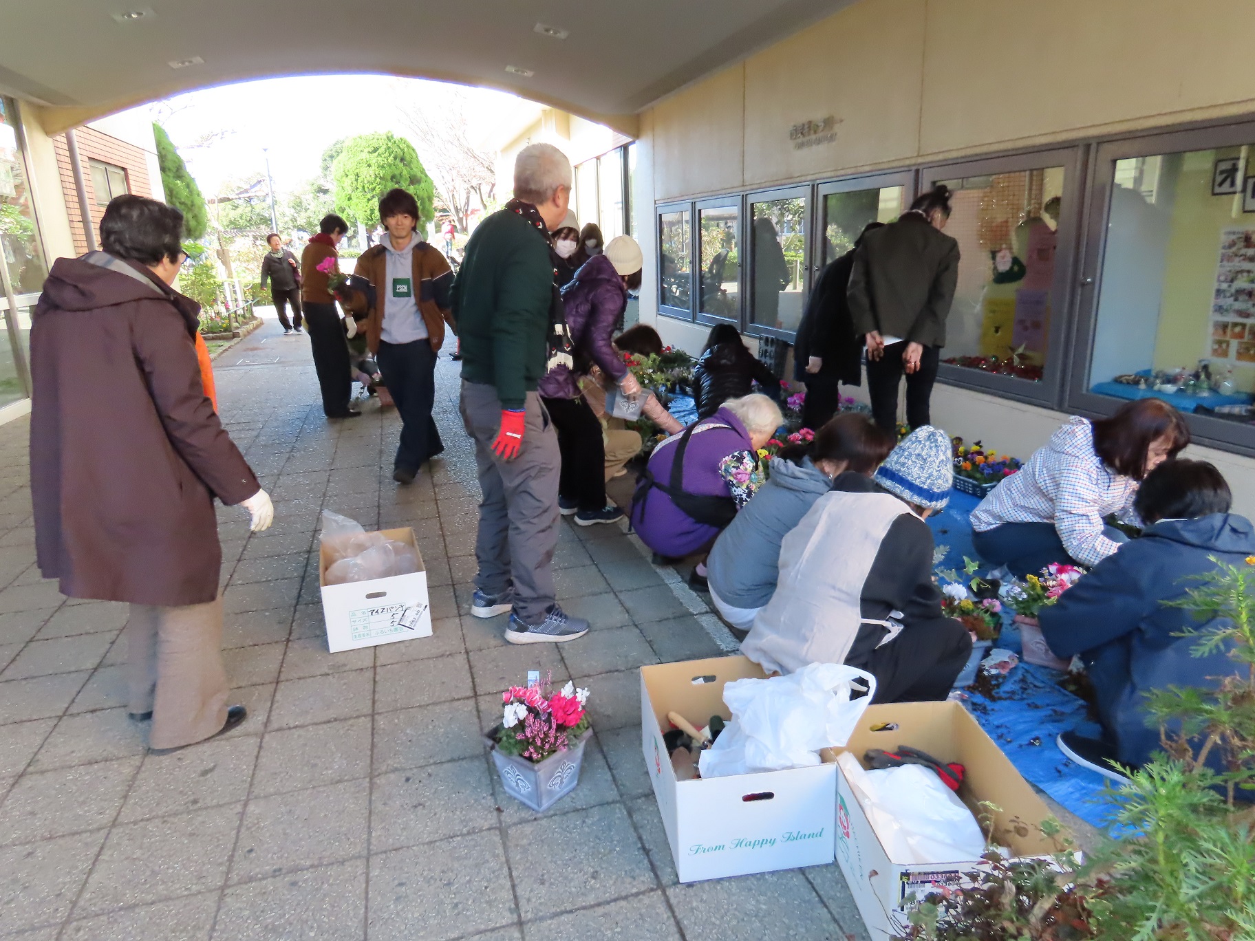 お花屋さんが地区センターにやって来た パンジーやガーデンシクラメン ブルーデージー・ガーベラ 色とりどりの花々が 所狭しと並びます ワクワクの作業です 講師からの 野菜の詰め放題 みたいに 沢山盛り込むのが 綺麗に見せるコツだよ~ 選ぶ作業に一層熱が入ります