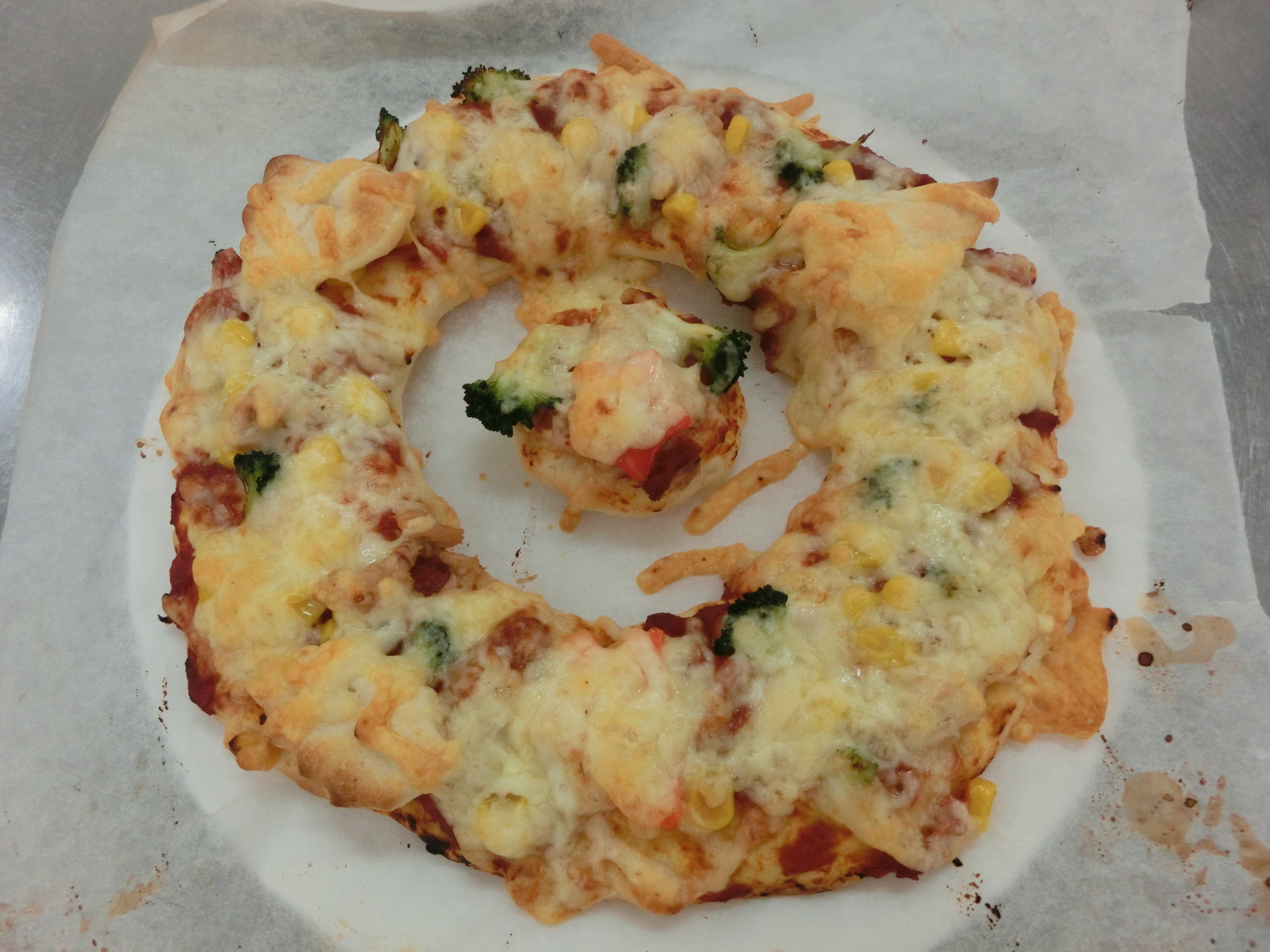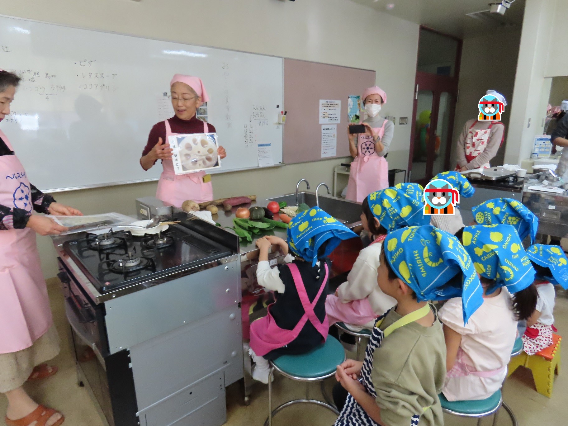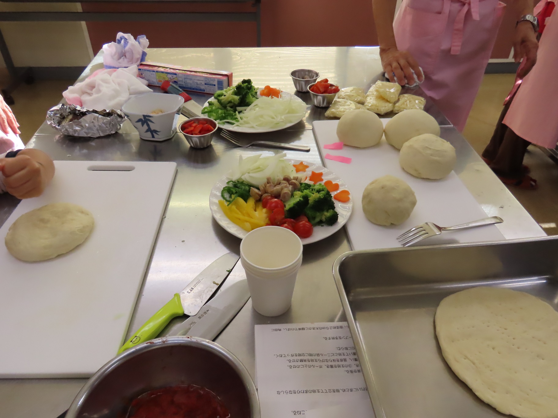 中区ヘルスメイト(食生活改善推進員) メンバー皆さんの指導による「ピザ作り」 子どもたちはお揃いのバンダナで こねこね後の発酵時間を使って 食育のおはなし 野菜クイズは驚きの速攻回答 今年もクリスマストッピングで 美味しく 可愛く焼きあがりました