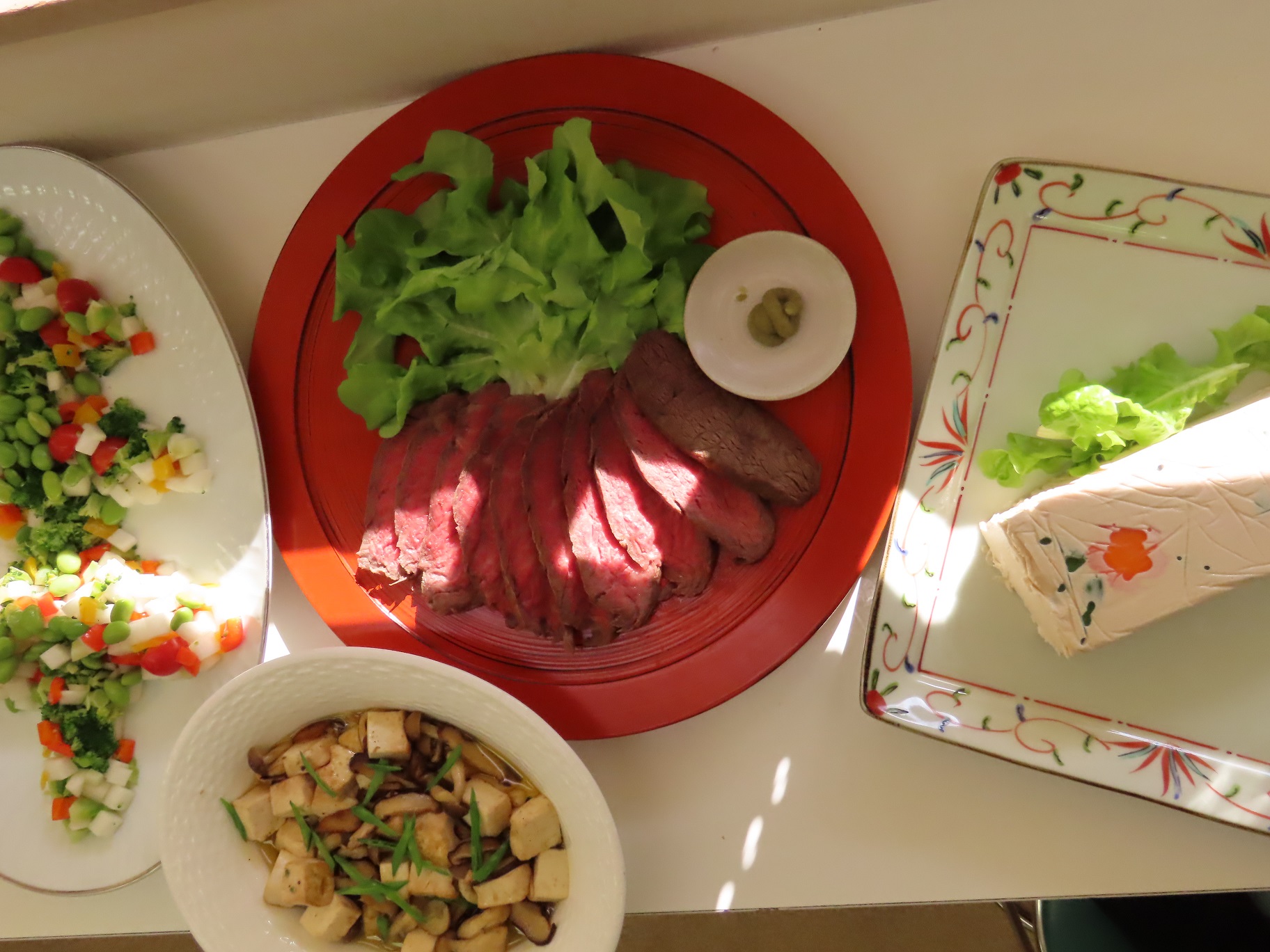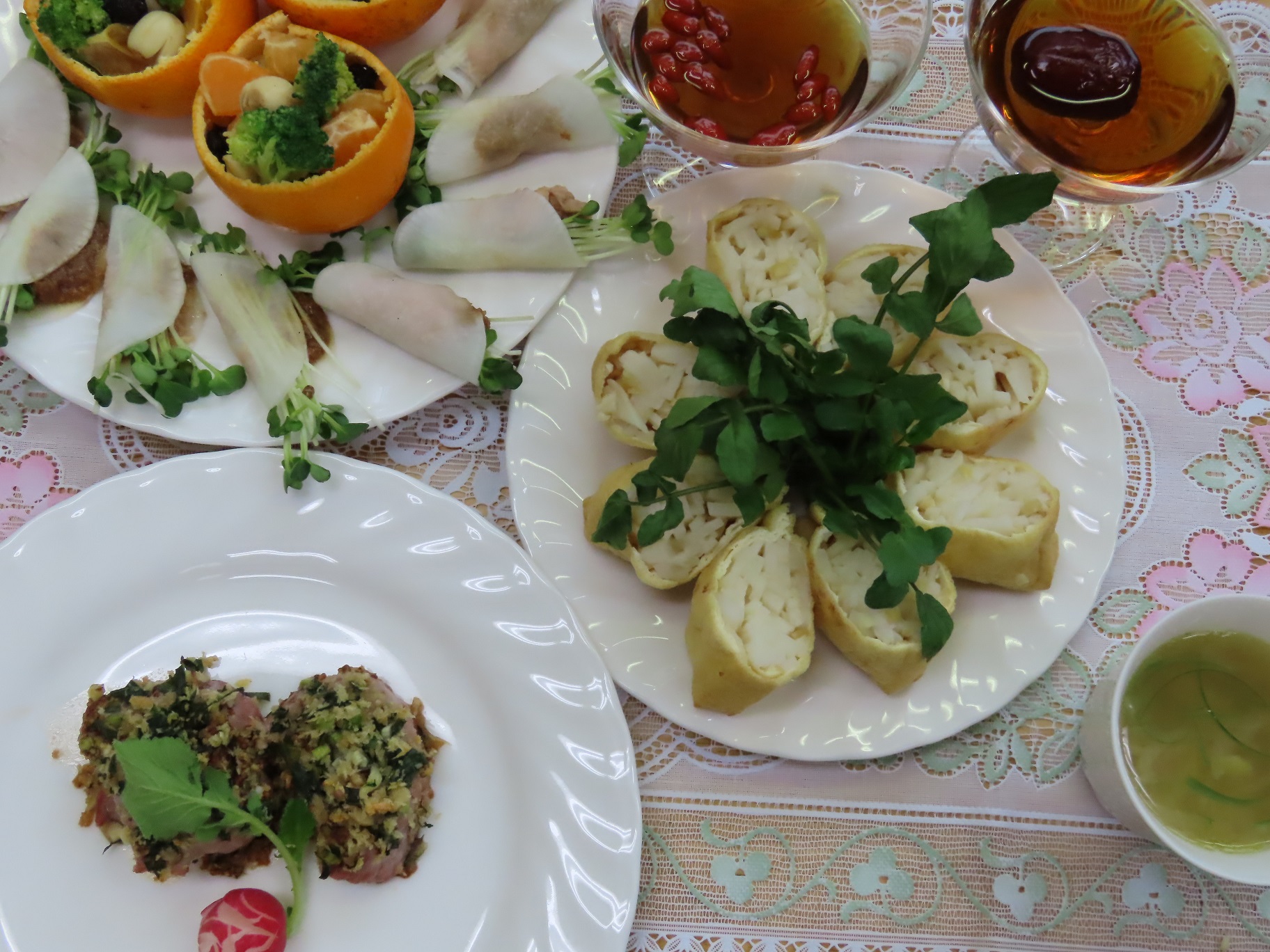 花びら大根 山芋の茶巾焼き ミカンと蓮の実のサラダ パエリア風ピラフ ラム肉と胡桃と韮のパン粉焼き 長ネギのスープ 薬酒 枸杞(くこ)・ブルーベリー酒 パイナップルと棗(なつめ)酒 お屠蘇
