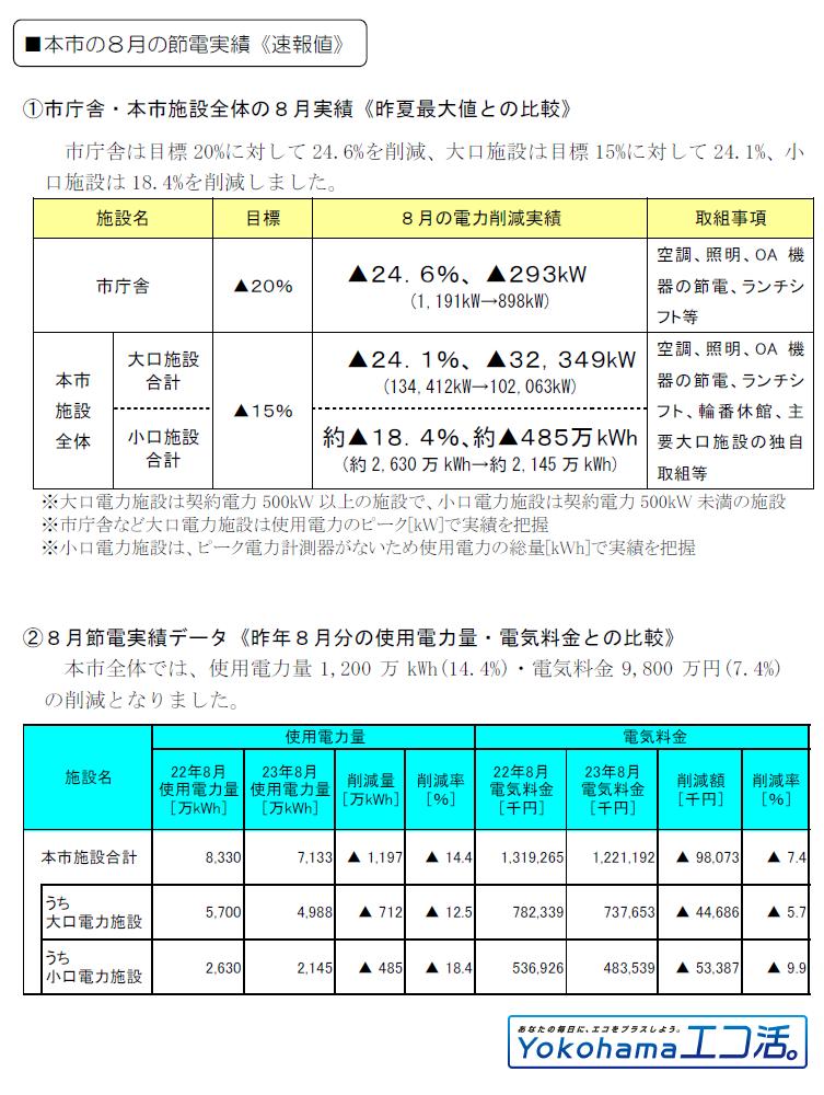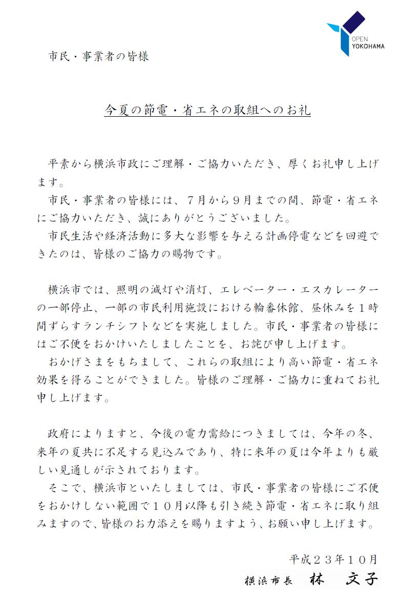 おかげさまをもちまして、これらの取組により高い節電・省エネ効果を得ることができました。皆様のご理解・ご協力に重ねてお礼申し上げます。 政府によりますと、今後の電力需給につきましては、今年の冬、来年の夏共に不足する見込みであり、特に来年の夏は今年よりも厳しい見通しが示されております。 そこで、横浜市といたしましては、市民・事業者の皆様にご不便をおかけしない範囲で10月以降も引き続き節電・省エネに取り組みますので、皆様のお力添えを賜りますよう、お願い申し上げます。