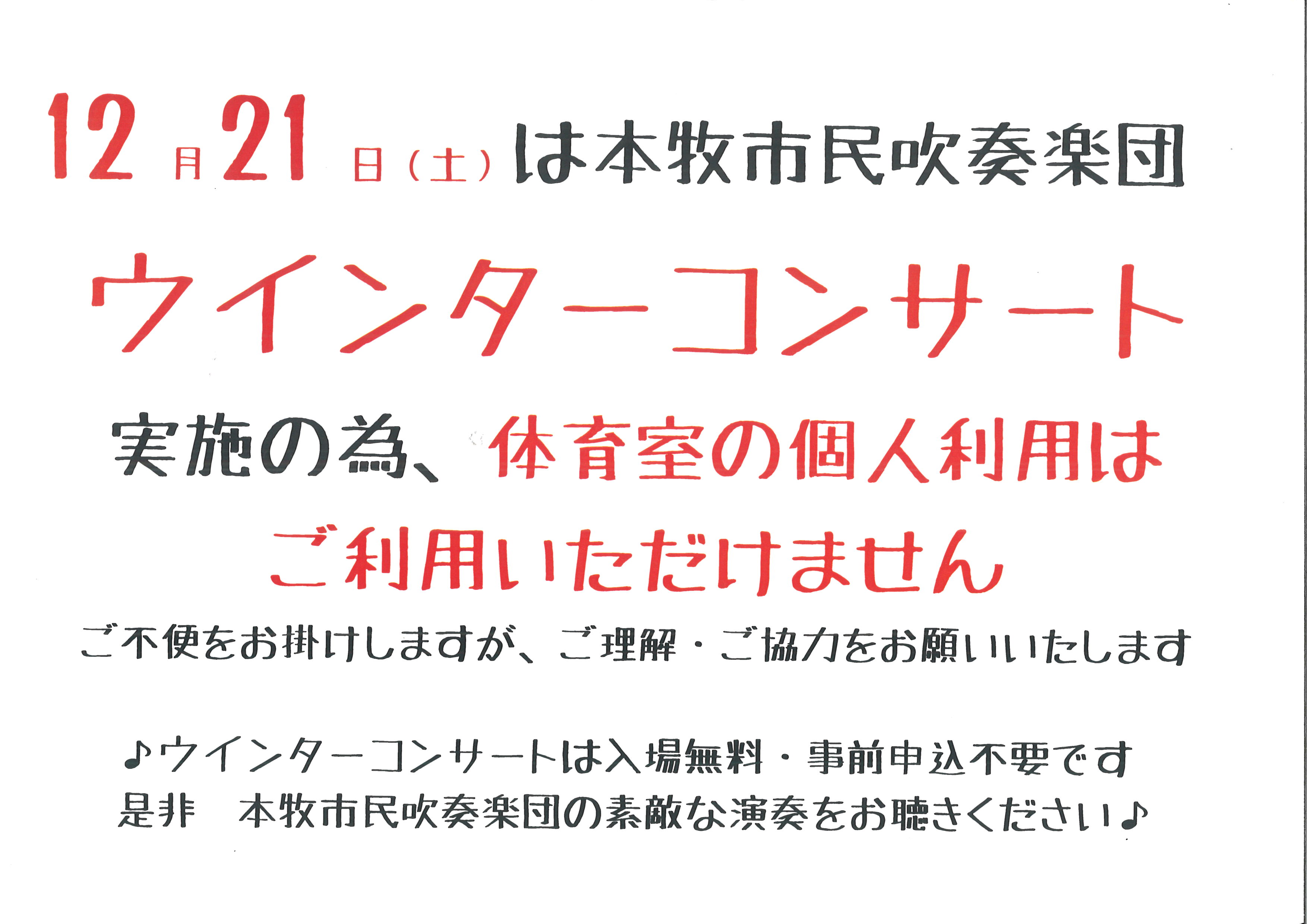 12月21日体育室個人利用の時間帯はご利用頂けません