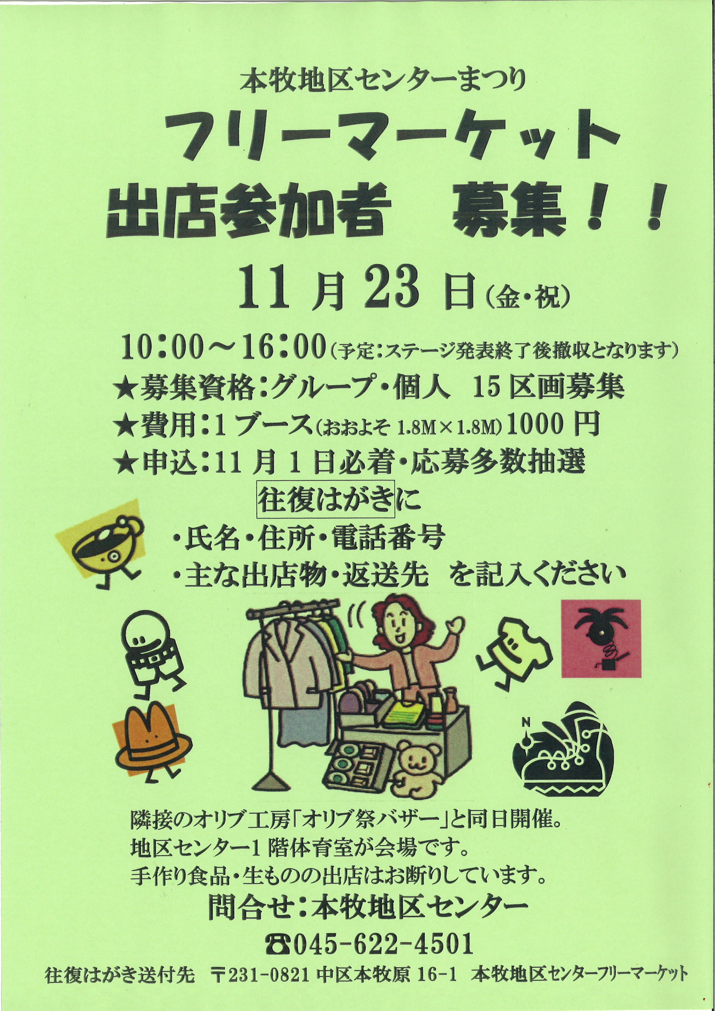 11月23日(金・祝)10:00~16:00(予定)募集◇:グループ・個人 15区画募集