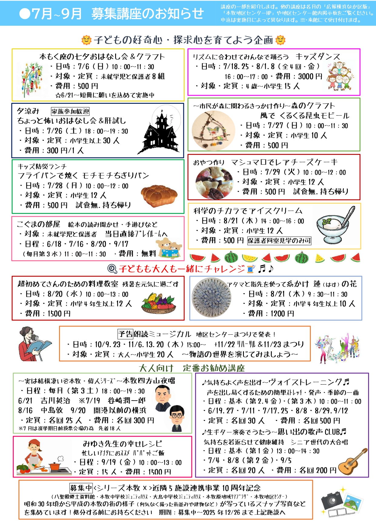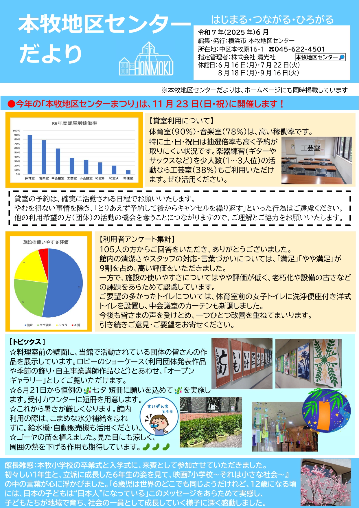 部屋の稼働率、アンケート結果、最近のトピックスなどを掲載。 7月~9月の募集講座もご案内しています。