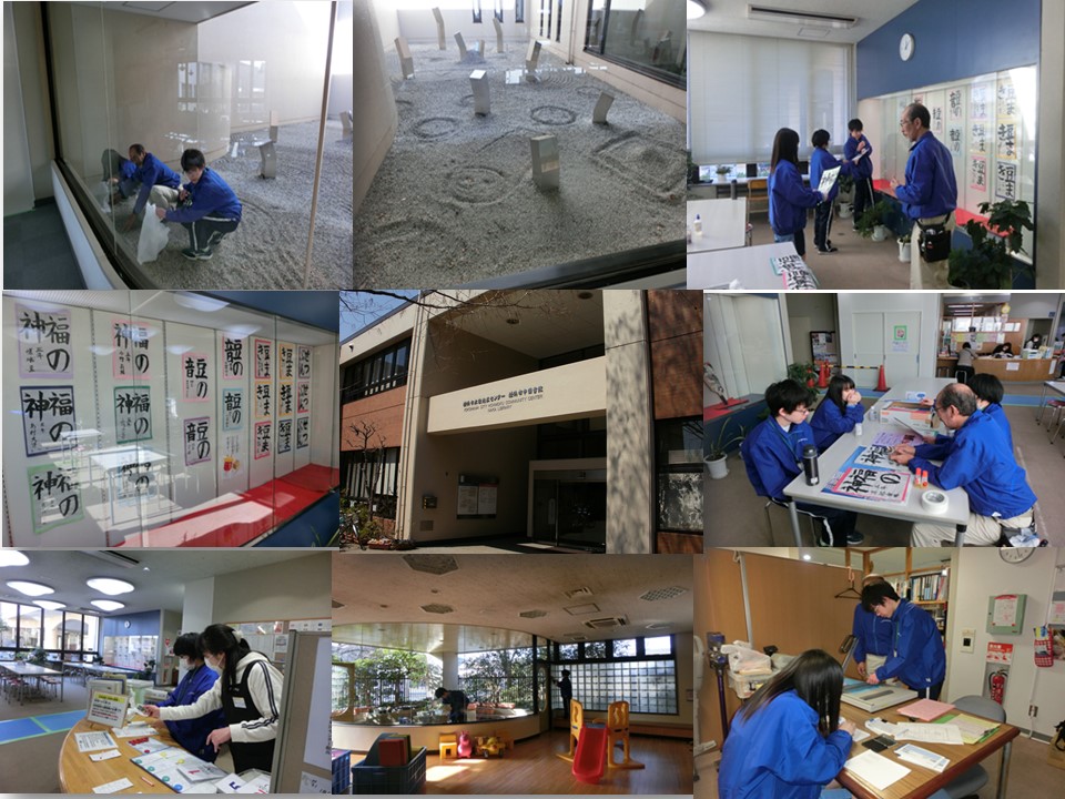 本牧地区センターの設置目的を理解してもらうことと、第一にご利用者様の視点に立って行動してもらい作業に入りました。最初にセンター2階の「光の庭」の清掃と庭のアレンジを考えてもらいました。節分が近いということで、鬼の顔や恵方巻をイメージしたデザインで仕上がり、来館されたお客様に楽しんで頂きました。次に当地区センターご利用の「こども書道」の会員さんの節分をお題にした書道の作品を1階ロビーショーケースに展示してもらい華やかになりました。