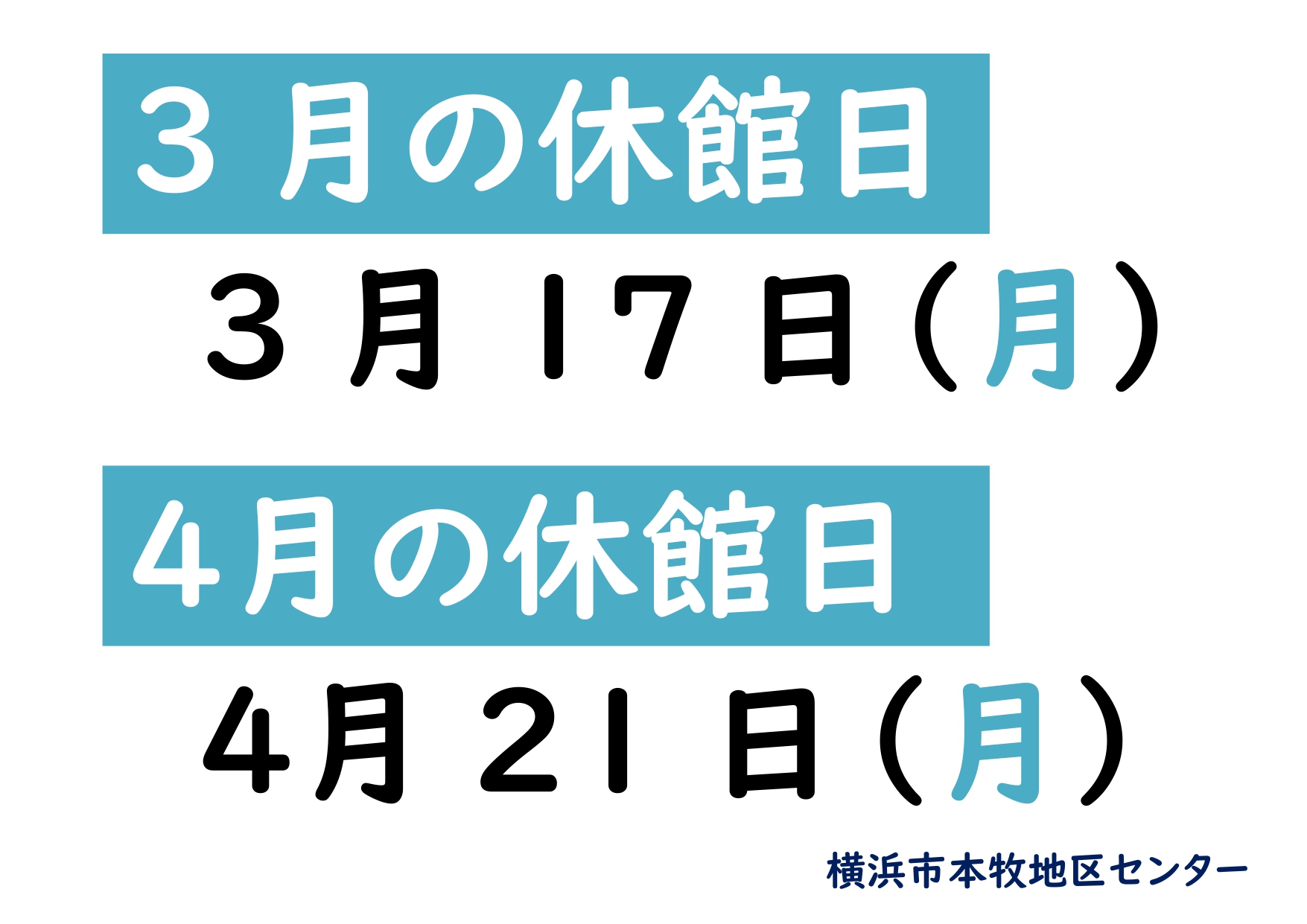 令和7年3月・4月の休館日は、 3月17日(月)、4月21日(月)です。