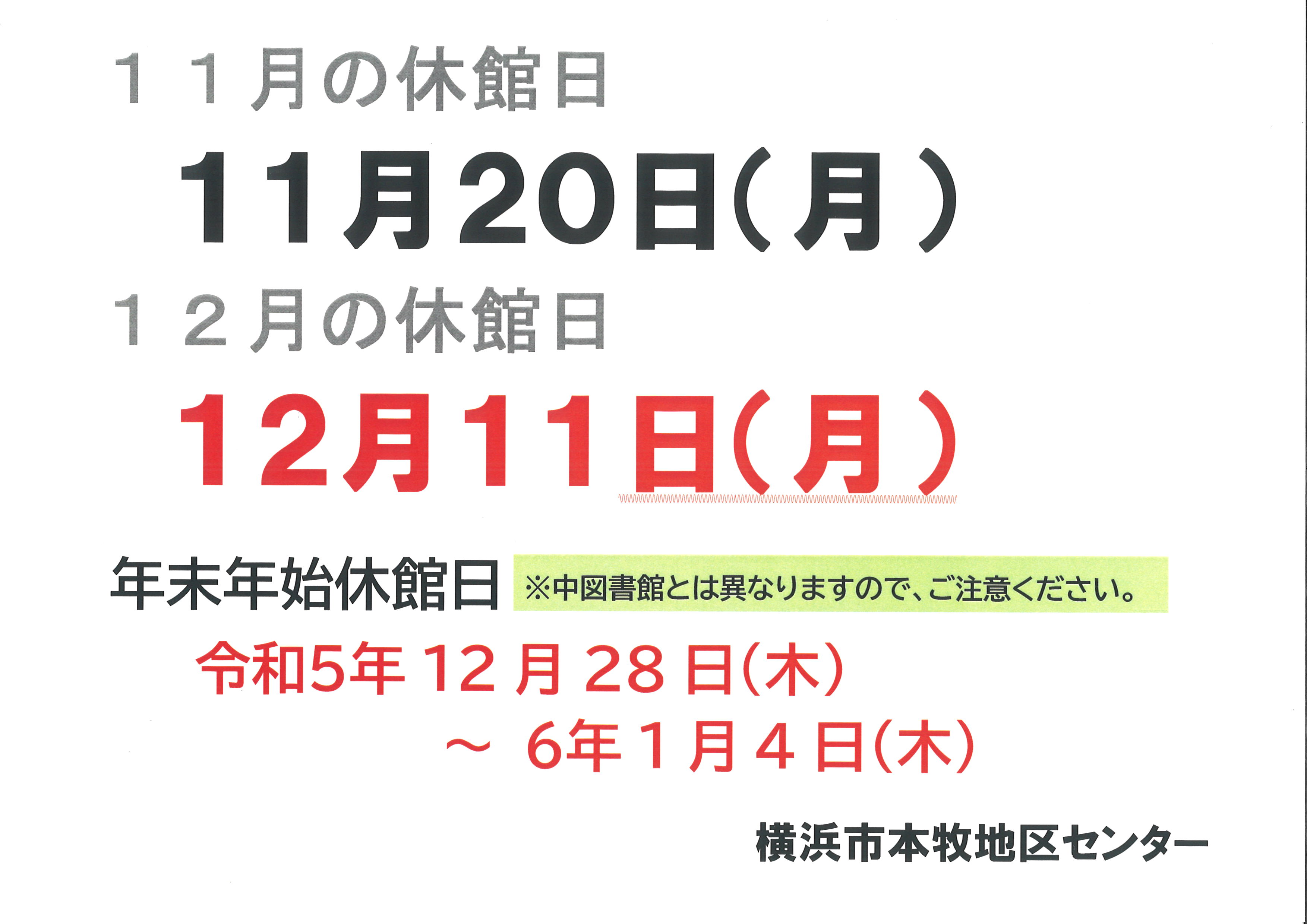 11月、12月、年末年始の休館日のお知らせ