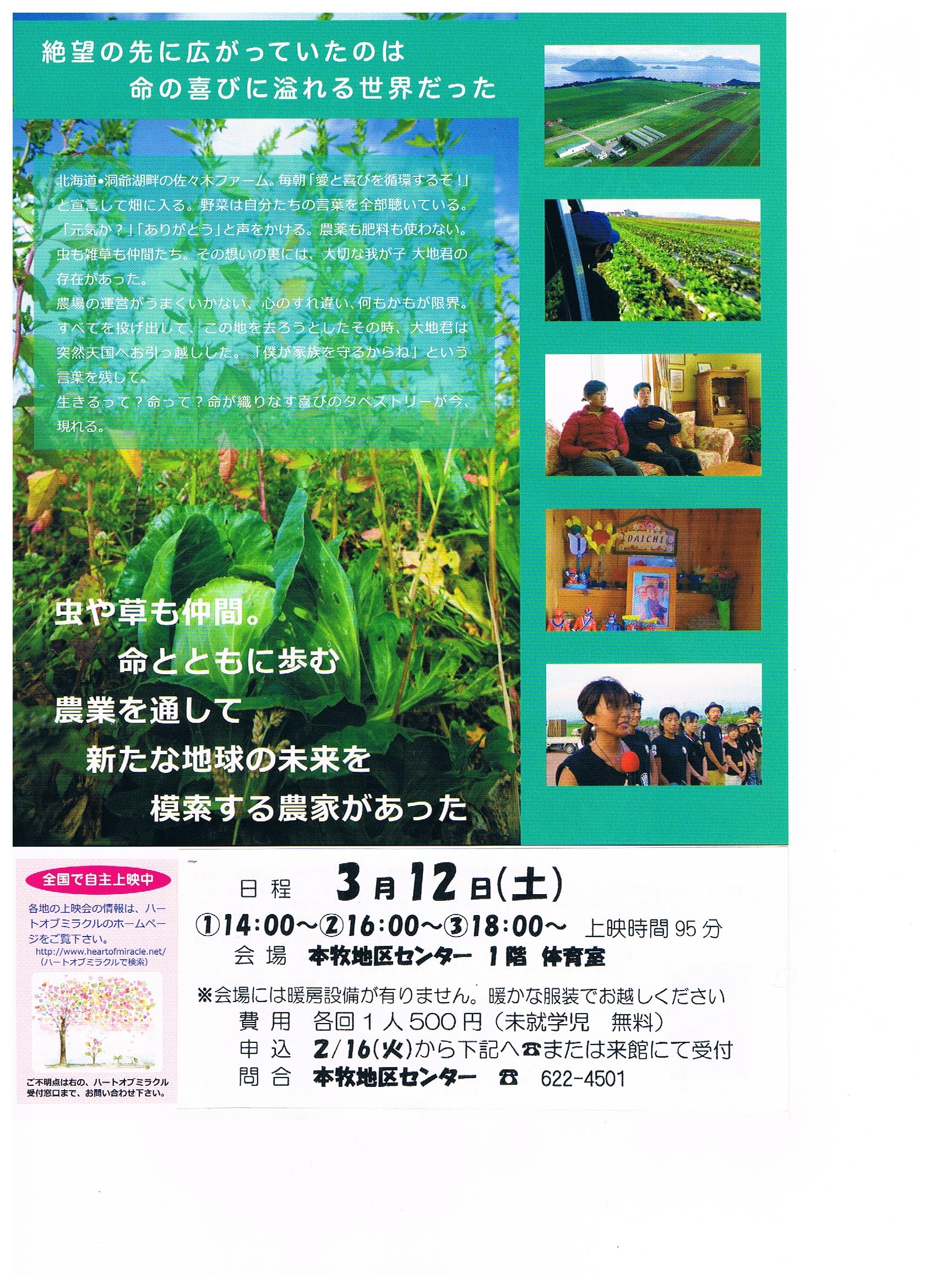 北海道で農業を営む若者たちの記録映画「大地の花咲き」の上映です。とても地味な映画ですが農薬も肥料も使わず、雑草も抜かず、野菜を育てています。