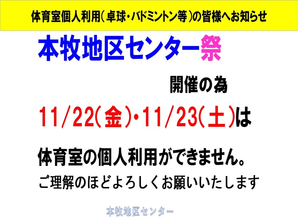 本牧地区センター「まつり」のため11月22日・23日はご利用制限があります。