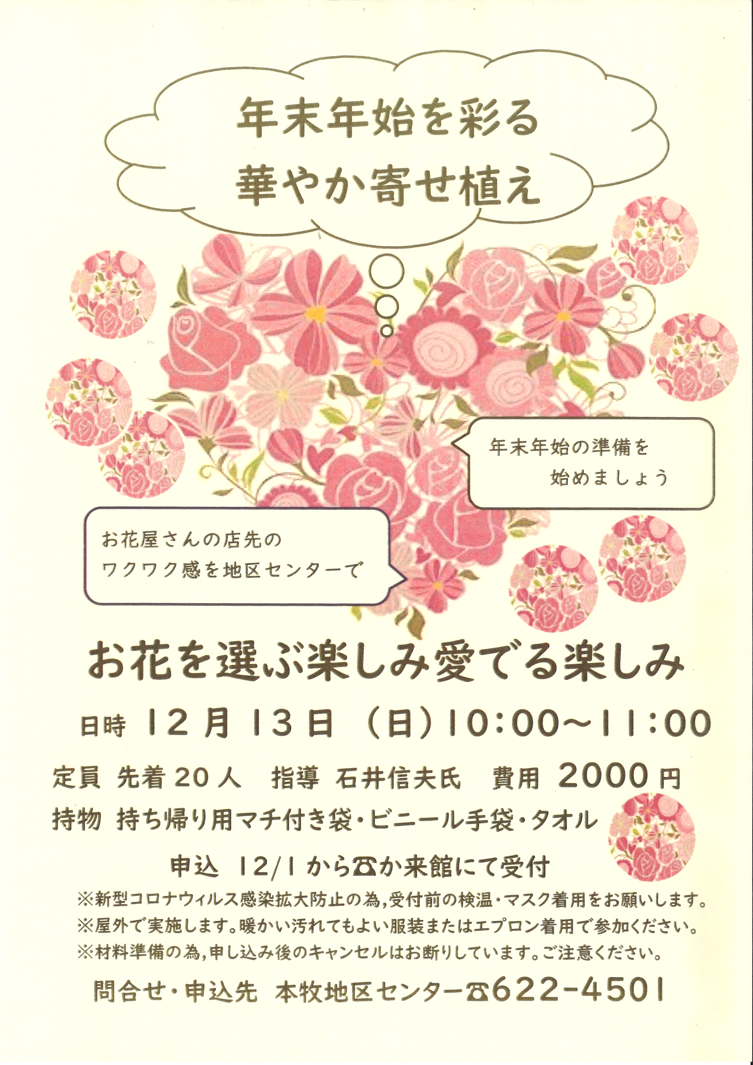 地区センター主催の「年末年始を彩る華やか寄せ植え」実施のため