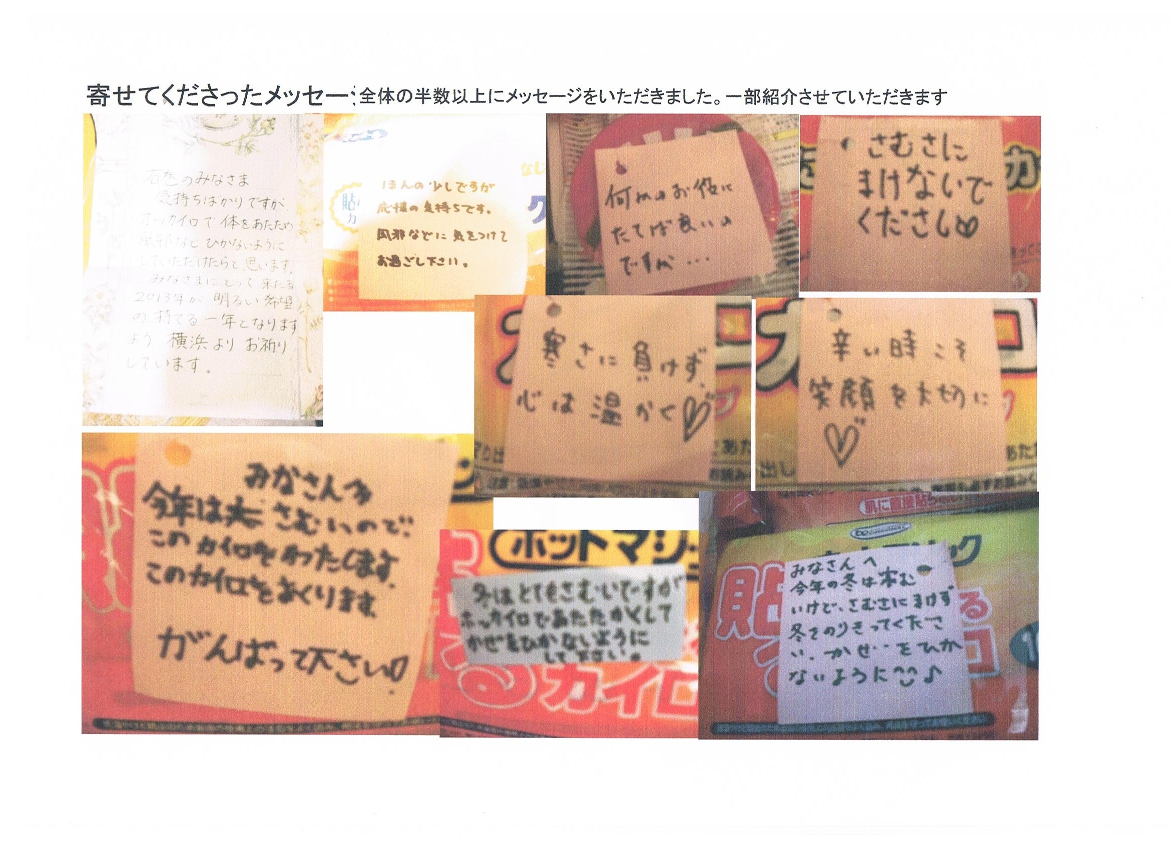 みなさまからのカイロの半数以上に、心のこもったメッセージが添えられておりました。(一部写真で紹介)