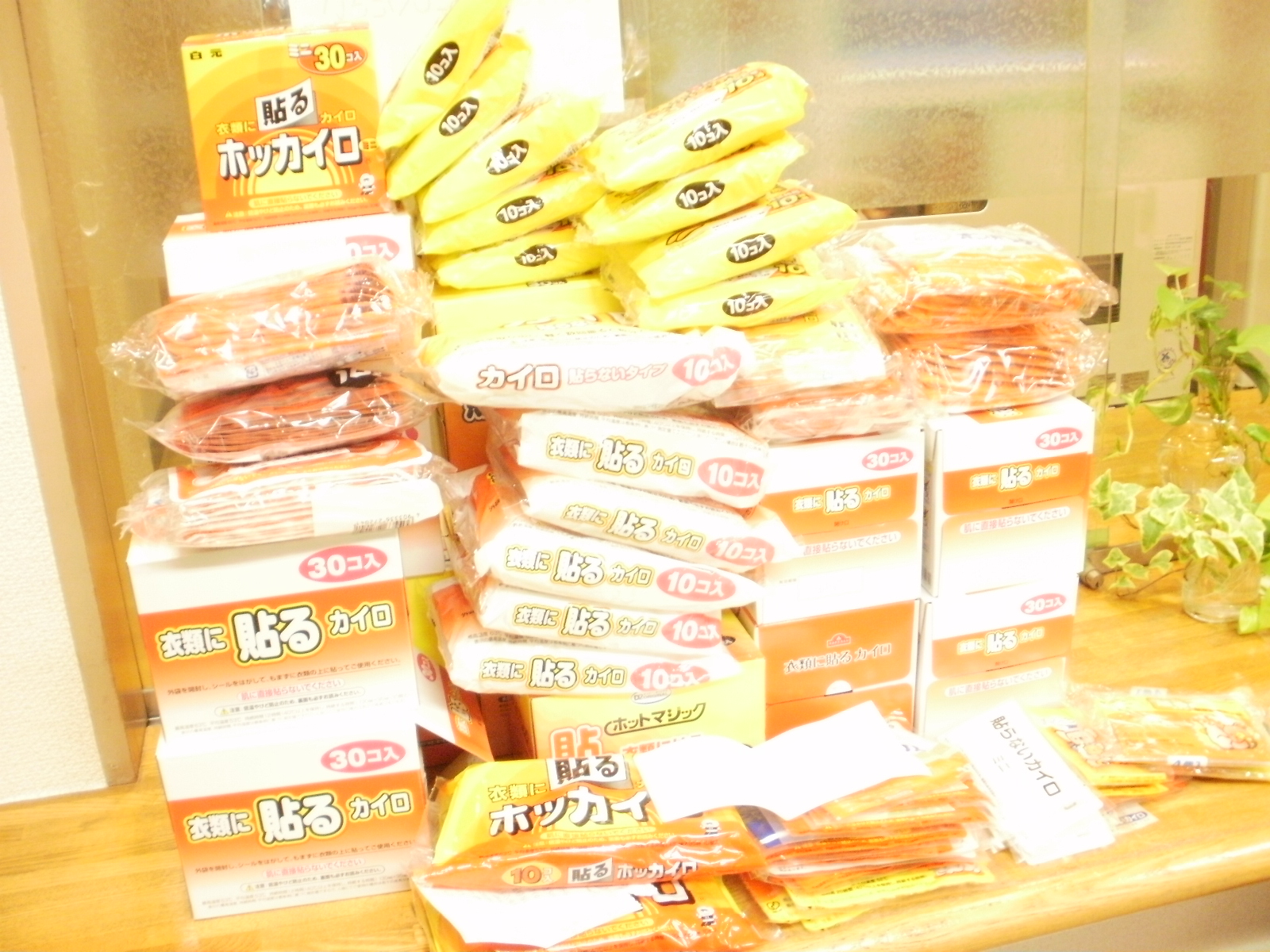 寒さの厳しい被災地に、少しでも早くお届けしたいと思っておりましたが、おかげさまで、総計1381点のカイロをクリスマス前にお贈りすることができました。