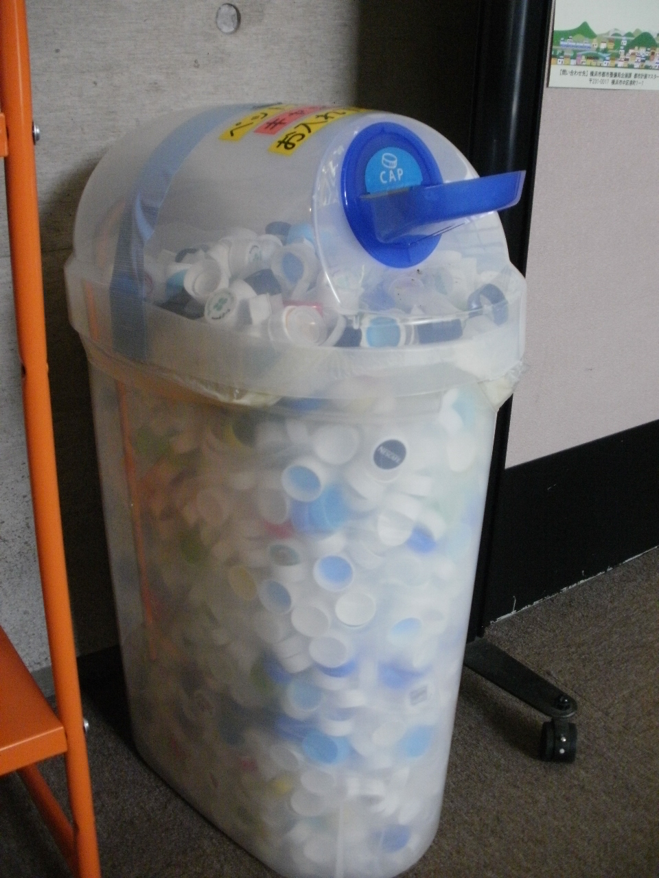 7月末に4回目の回収分(3600個)をエコキャップ推進委員会に送りましたが、8月上旬、すでに回収ボックスが右の写真のようにいっぱいになりました。
