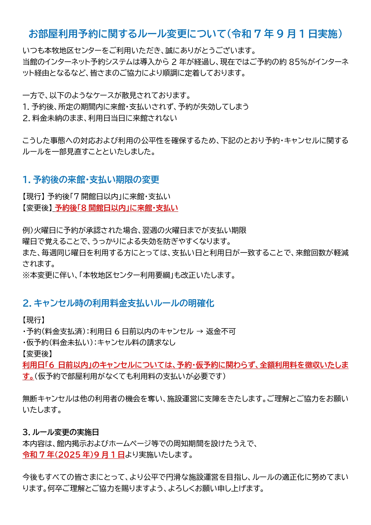 下記のとおり予約・キャンセルに関するルールを一部見直すことといたしました。