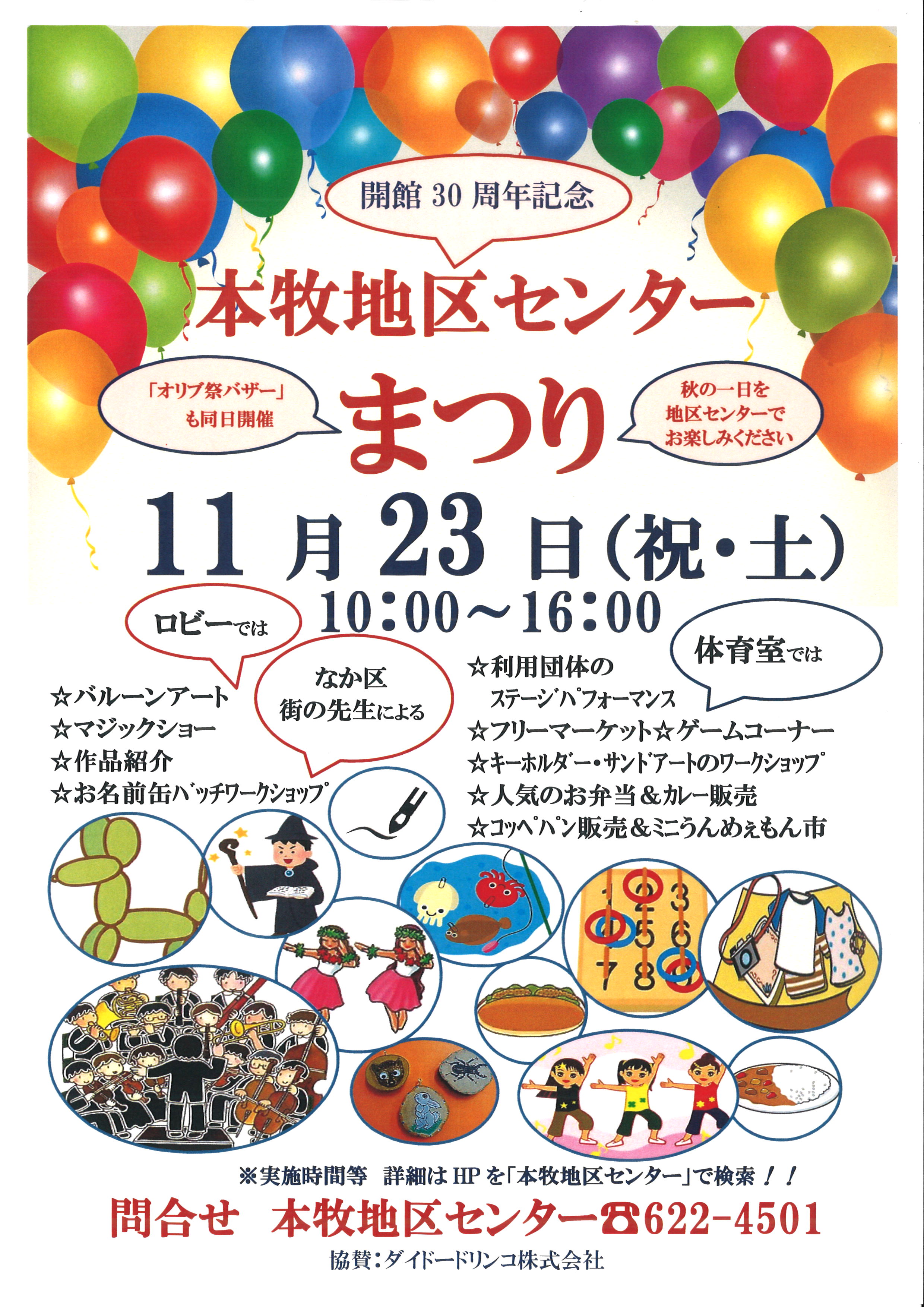 隣接のオリブ工房「オリブ祭バザー」と同日開催 令和1年11月23日(祝・土曜日)10:00~16:00 地区センター1階が主な会場です。