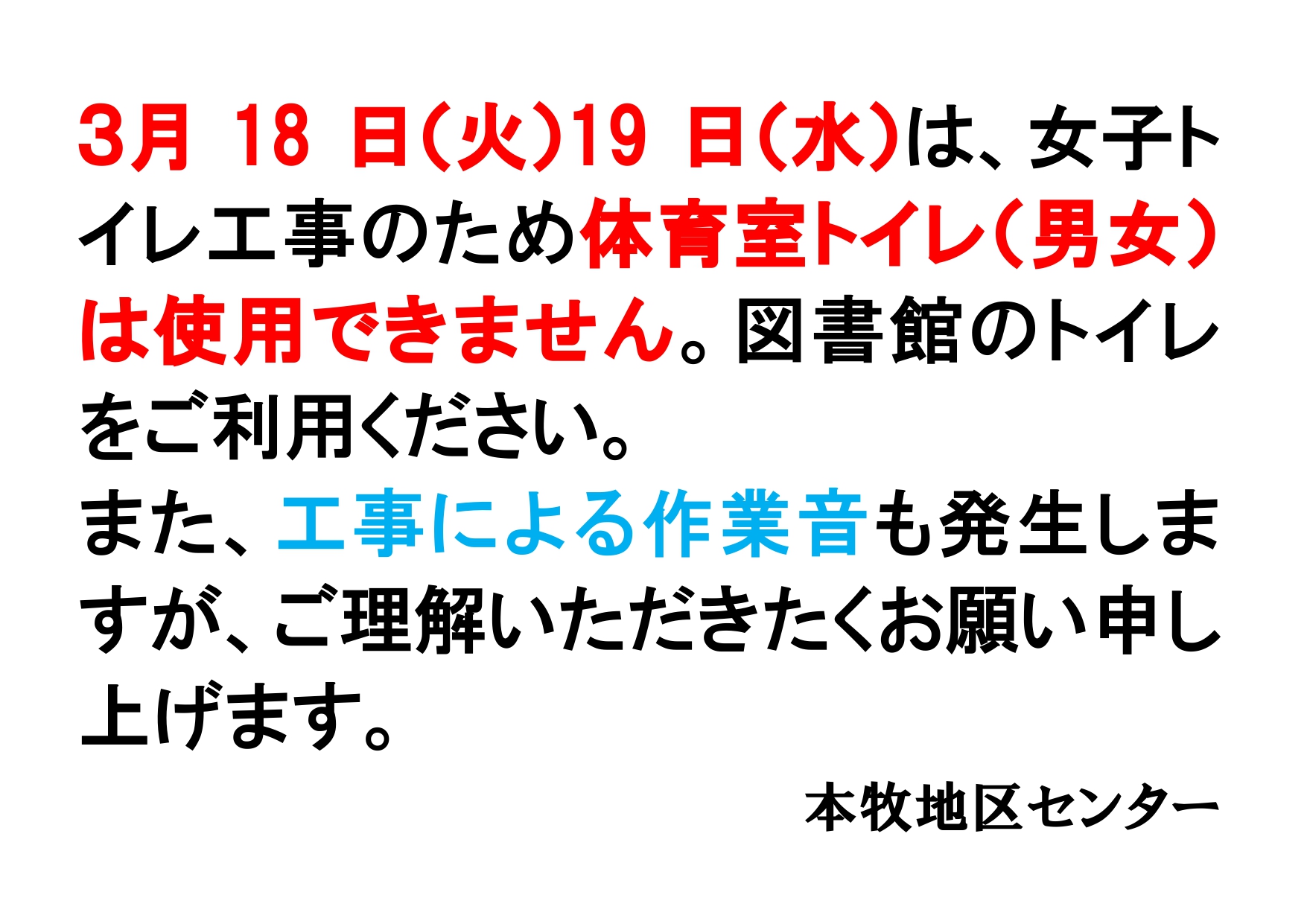 3月18日・19日1階体育室女子トイレ工事に伴うお願い