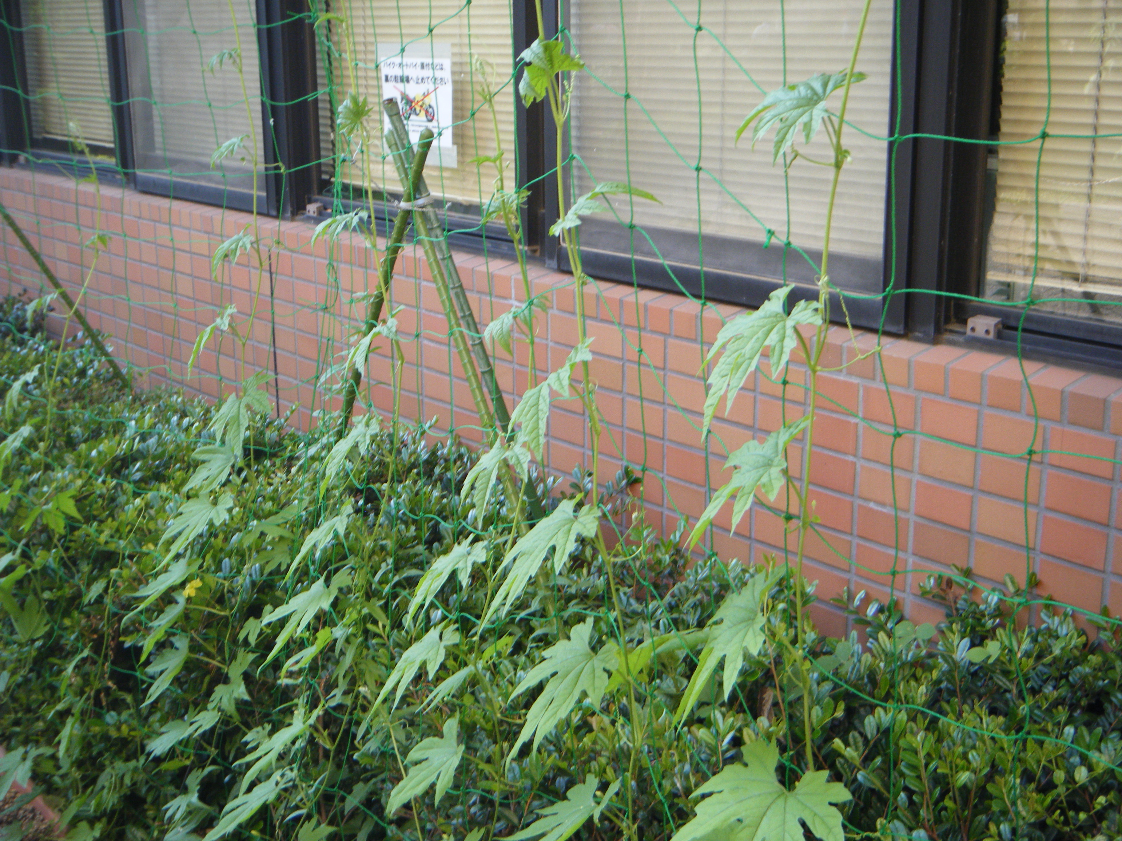緑のカーテン ゴーヤが元気よく、花も咲かせのぼりはじめました。