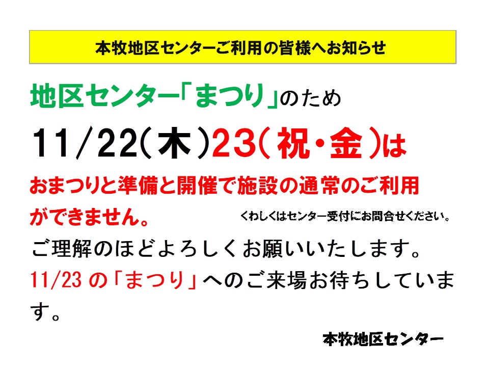 本牧地区センター「まつり」のため11月22日・23日はご利用制限があります。