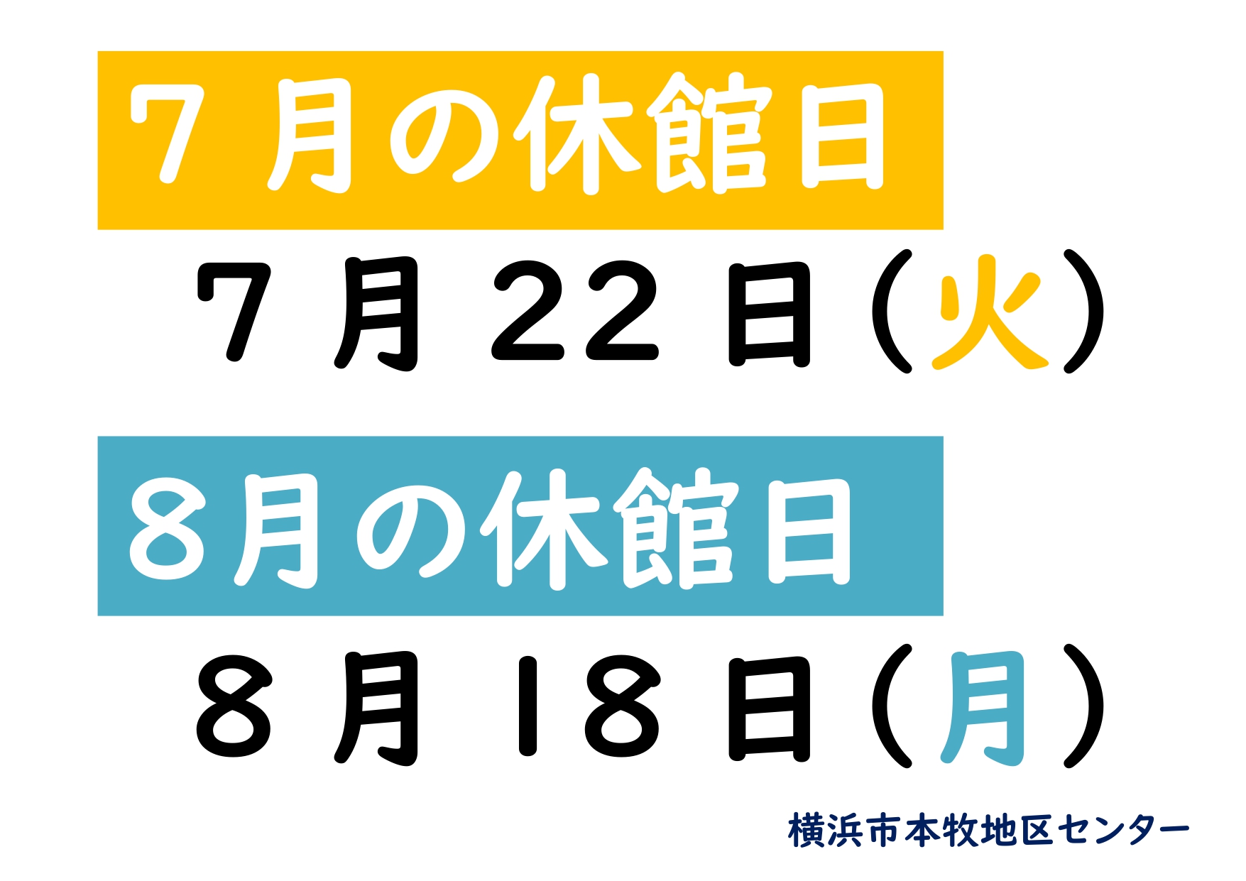 令和7年7月・8月の休館日は、 7月22日(火)、 8月18日(月)です。